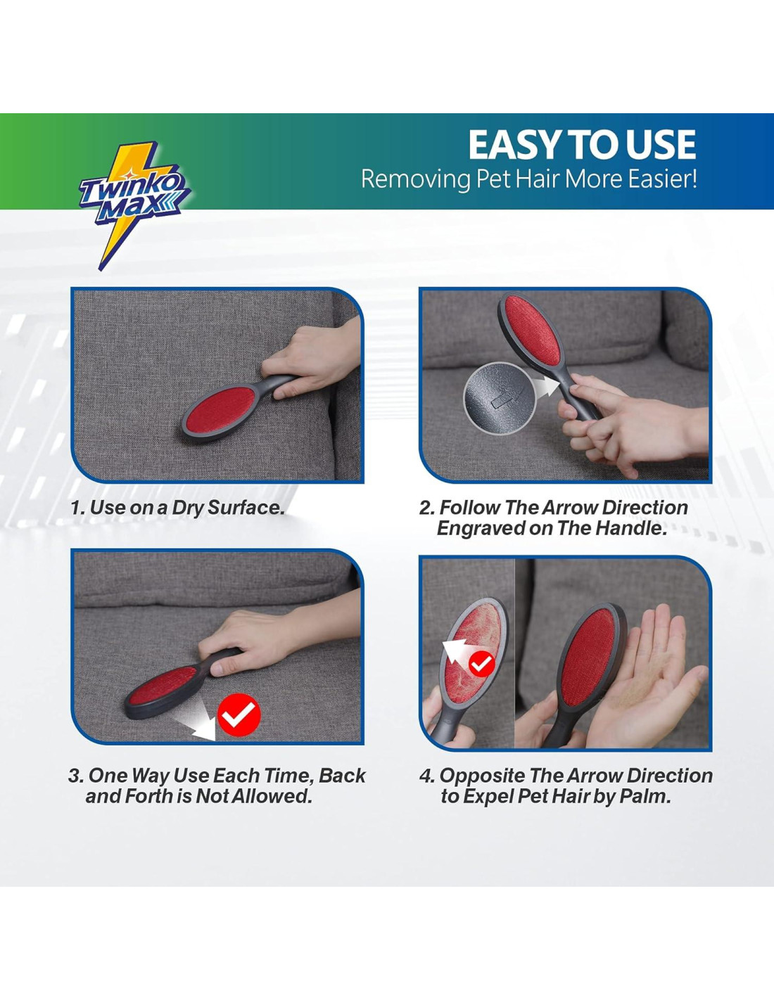 - [Fácil de Usar] el removedor de pelo es bastante fácil de usar. Sigue la flecha en el mango para recoger pelusa y pelo, en la dirección opuesta para expulsar lo que deseas deshacerte. Por favor, usa en una tela seca y un solo uso cada vez, no se permite de atrás hacia adelante.
