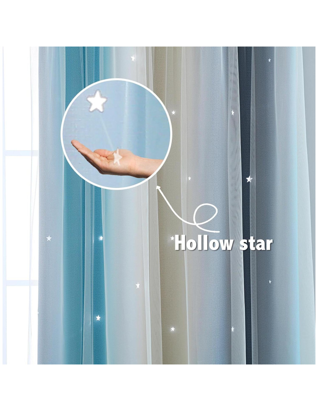 - Diseño Único: Nuestras cortinas para niños presentan un diseño de doble capa, con la capa interior mostrando cortinas blackout impresas y la capa exterior adornada con tul. Usando tecnología láser de vanguardia, cortamos intrincadamente estrellas en la cortina interior. Cuando la luz del sol filtra a través, crea un efecto de cielo estrellado hipnotizante, perfecto para despertar la imaginación y la maravilla.