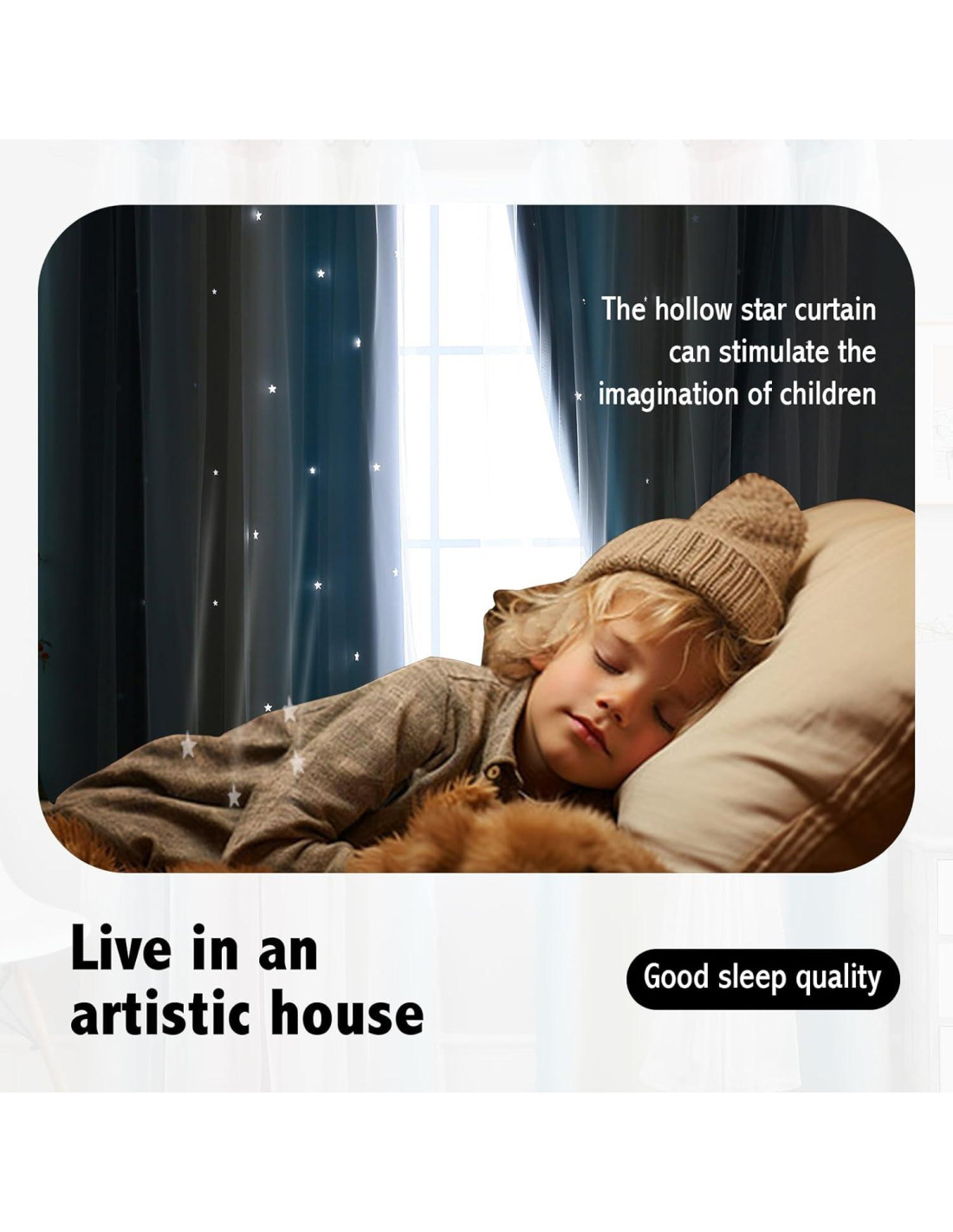 - Diseño Único: Nuestras cortinas para niños presentan un diseño de doble capa, con la capa interior mostrando cortinas opacas impresas y la capa exterior adornada con tul. Usando tecnología láser de vanguardia, cortamos intrincadamente estrellas en la cortina interior. Cuando la luz del sol filtra a través, crea un efecto de cielo estrellado hipnotizante, perfecto para despertar la imaginación y la maravilla.