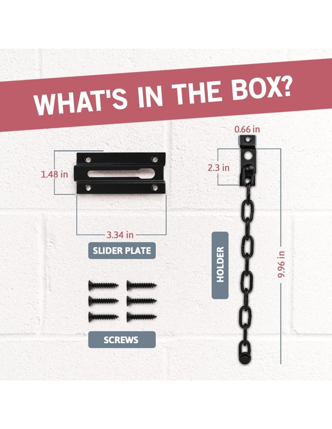 - Instalación Sin Problemas: ¡Solo mide, marca y fija! Todo lo que necesitarás es un taladro y unos minutos. Nuestras cerraduras de cadena para puertas vienen con tornillos e instrucciones para la conveniencia de todos.