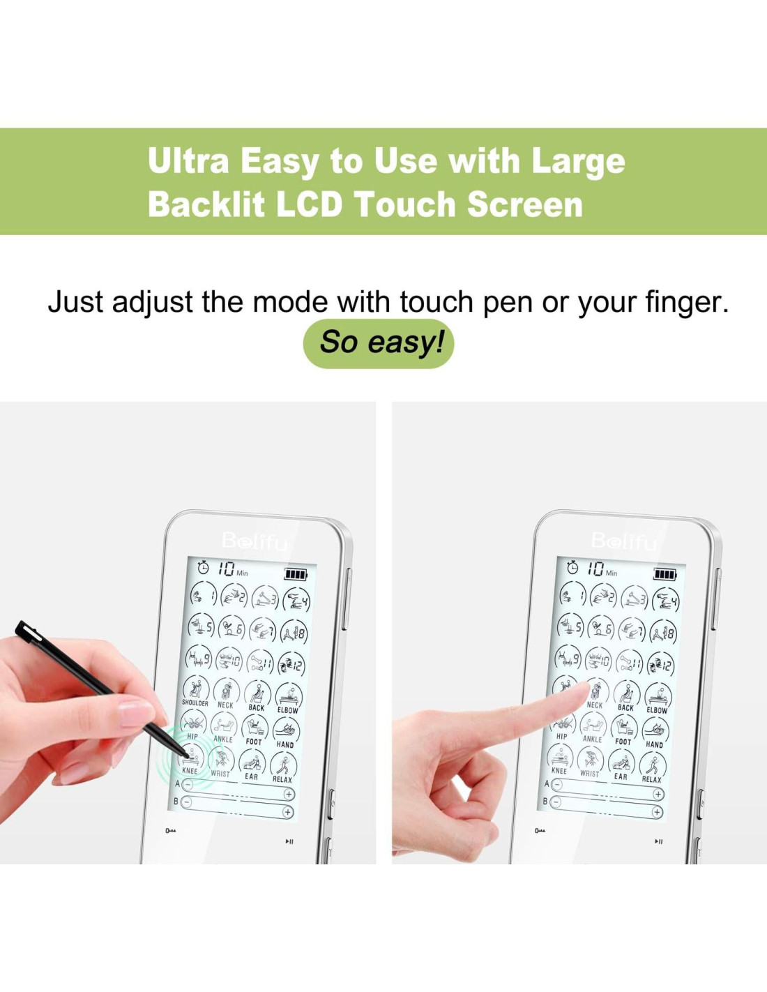 Si tienes dolor crónico o agudo, ¡prueba el masajeador TENS Belifu! Es una opción no invasiva y no farmacológica para aliviar el dolor con tecnología de simulación del cuerpo humano, tecnología de bioelectricidad, tecnología de control inteligente por microcomputadora, simula una variedad de métodos de masaje como ventosas, acupuntura, etc. Ayuda a tratar el dolor de espalda, discos/articulaciones artríticos o inflamados, tensión en los hombros y alivio muscular. Operarlo como dos máquinas separadas, disfruta de 2 modos de masaje al mismo tiempo. Los canales del masajeador TENS Belifu están completamente aislados, lo que te permite seleccionar no solo el nivel de intensidad, sino también diferentes programas y tiempos de tratamiento para cada canal. Lo que eso significa para ti es que puedes operarlo como si fueran dos máquinas separadas a la vez. Encuentra un estimulador muscular eléctrico recargable asequible que sea adecuado para ti. Con el masajeador de pulso con pantalla táctil LCD Belifu, no necesitas presionar el botón mini una y otra vez para seleccionar el modo que deseas. Simplemente toca la pantalla para seleccionar el modo que te gusta con un lápiz táctil o tu dedo. ¡Tan fácil! Consejos de uso: 1. Si solo conectas un cable, debes asegurarte de que dos almohadillas conectadas con el mismo cable estén colocadas en tu piel al mismo tiempo para que la unidad funcione correctamente.