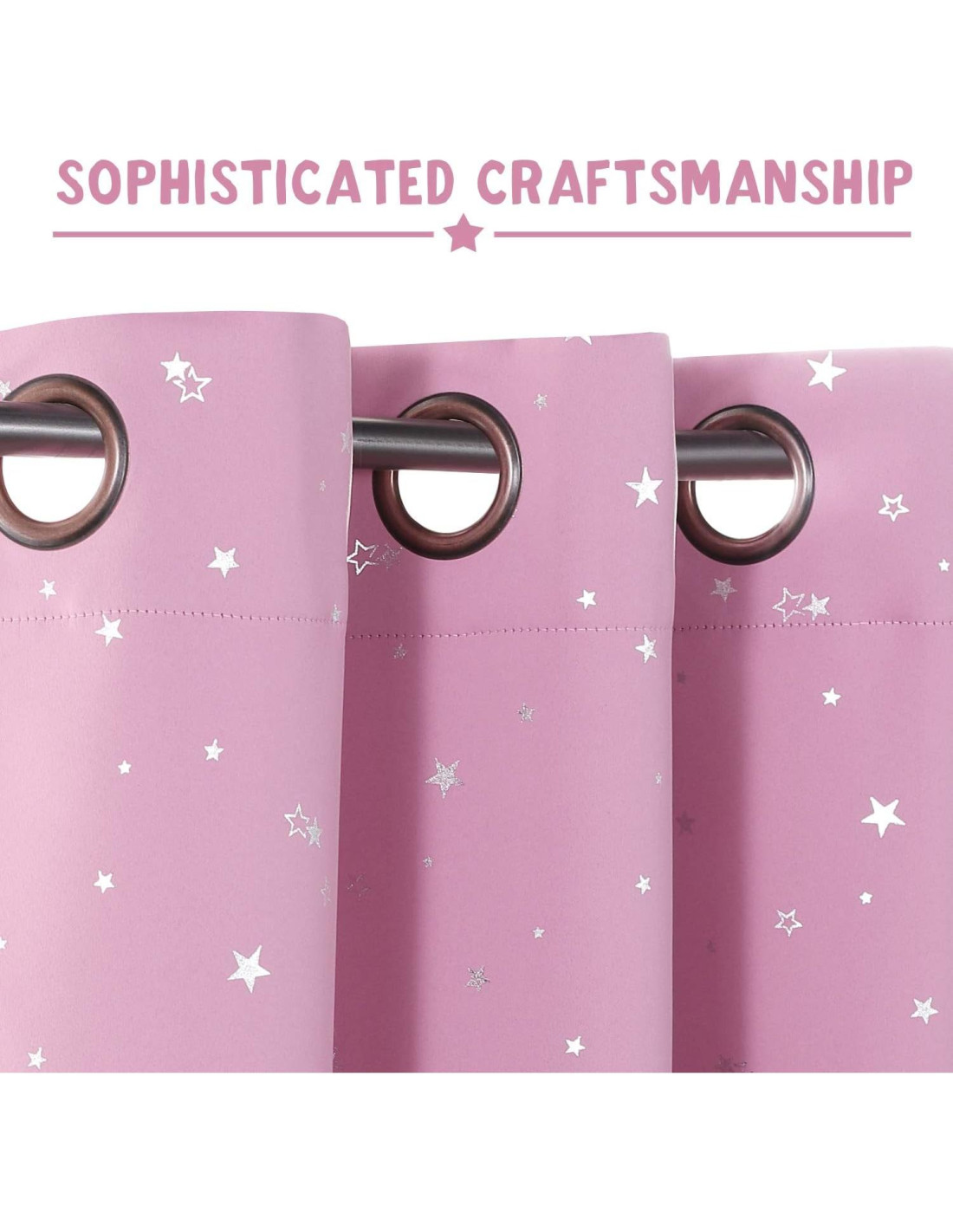 - BIEN HECHO: Cada paquete contiene 2 paneles de cortinas blackout con estrellas brillantes para la habitación de los niños. Con hilos recortados y sin arrugas, cada panel está construido con 8 ojales anti óxido que se ajustan bien a varillas de cortina de hasta 1 1/2 pulgadas (3,81 cm) para una fácil instalación y deslizamiento