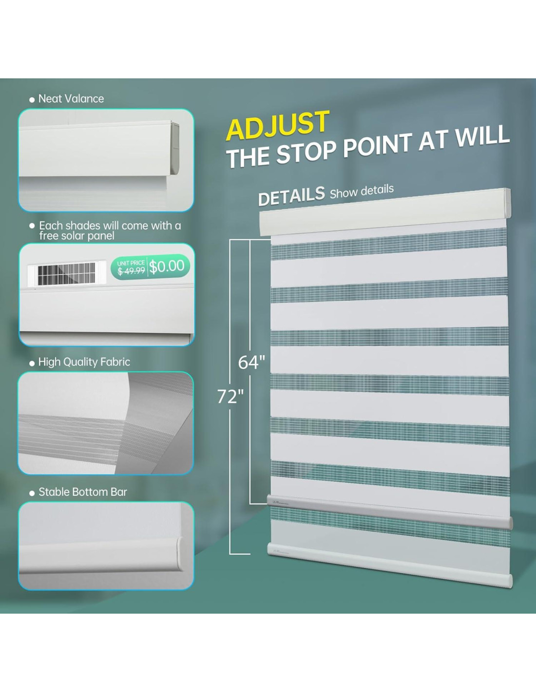 - LUZ AJUSTABLE: Las persianas zebra eléctricas están hechas de una tela de doble capa que consiste en tela transparente y sólida alternante. Cuando se ajusta a la capa transparente, la luz puede pasar a través de las persianas zebra motorizadas, creando una hermosa luz y sombra en la casa. Cuando el ajuste es completamente de tela sólida, el sol es bloqueado, no interrumpirá tu descanso. Las persianas motorizadas con control remoto pueden proteger tu privacidad y permitirte experimentar la suavidad de la luz que entra en la habitación.