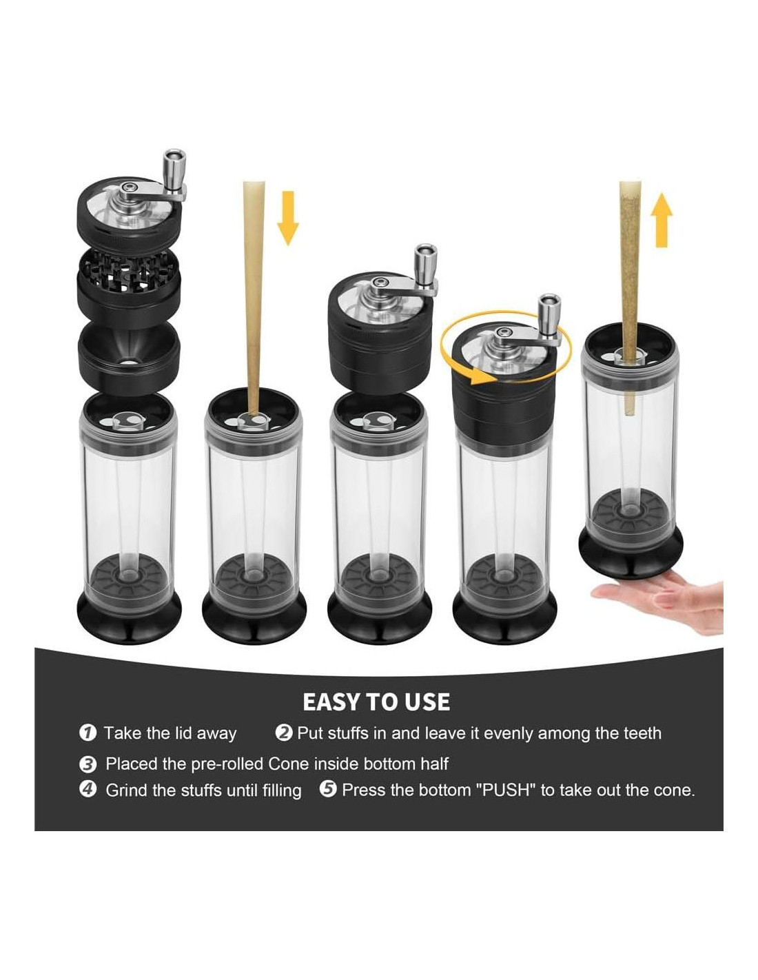 - Portátil y almacenable - El molino es compacto y ligero para fácil almacenamiento y transporte en tu bolsa o bolsillo. El sistema de llenado puede llenar los conos en 30 segundos, la cámara de almacenamiento puede contener hasta 7 conos. Este molino tiene un embudo incorporado y una cámara de almacenamiento de conos.