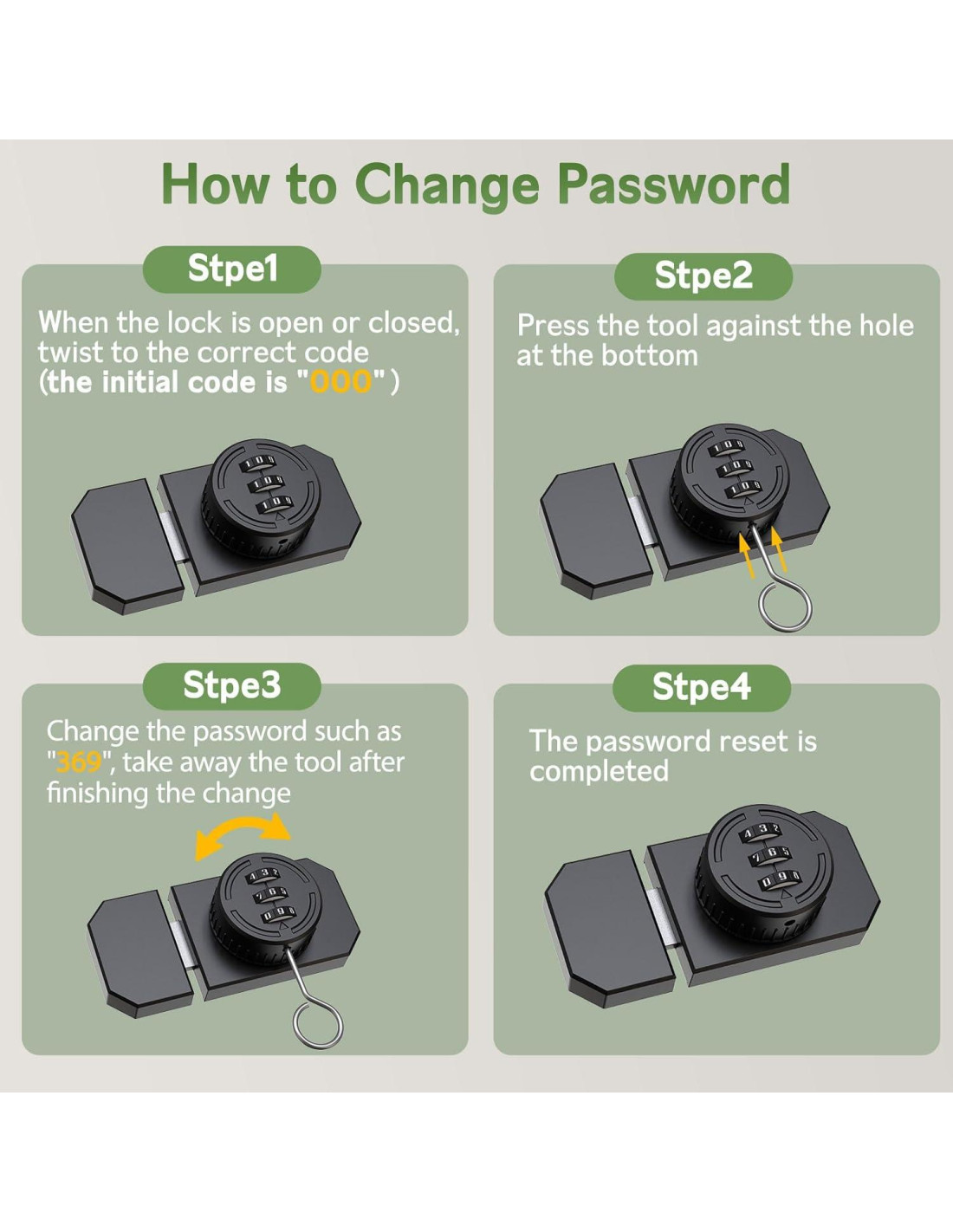 - Contraseña Reiniciable: El código de 3 dígitos ofrece 1000 combinaciones diferentes y es difícil de romper. Puedes reiniciar el código en cualquier momento, la contraseña inicial de la cerradura de armario sin llave es "000"