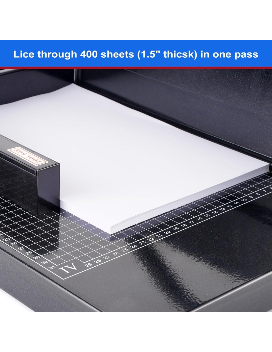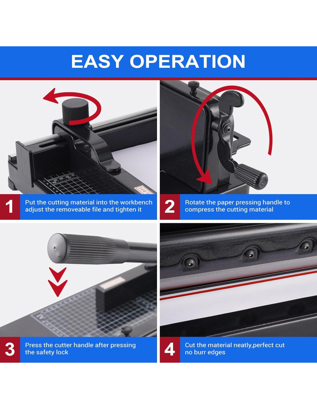 - [Amplia Aplicación] La cortadora de papel de alta resistencia con una longitud máxima de corte de 30.48 cm permite cortar hasta 400 hojas de papel (para papel A4 de 80g) de una vez; Además del papel común, nuestra cortadora de papel de alta resistencia también puede cortar materiales como PVC suave, cuero, tela no tejida, película de burbujas, algodón perlado de tela, etc., satisfaciendo sus diferentes necesidades de corte en la mayor medida posible y adecuada para hogares, aulas, oficinas, empresas, fábricas de impresión, copisterías, etc.
