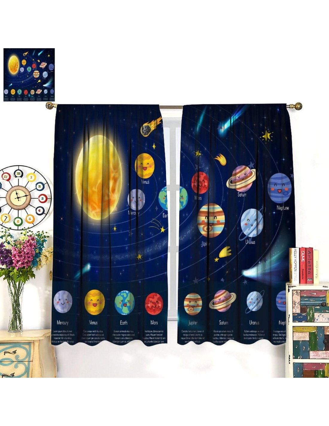 Experiencia nueva en la vida hogareña, productos de cocina con impresión de tema rico, añade color a tu cocina y mejora tu calidad de vida. Sobre la función: Solo puede filtrar el 90% de la luz y no puede bloquear completamente la luz o oscurecer la habitación, pero puede proteger la privacidad y generalmente no tiene requisitos especiales y es muy adecuado para uso en el hogar. La función principal de las cortinas es la decoración. Puede embellecer su habitación y mejorar el ambiente. Dormitorio, sala de estar, cocina, café, oficina, armario, puerta, baño, guardería, patio exterior, etc. Sobre el producto Material: 99.99% poliéster Paquete: 2 paneles Uso: A través de la cortina de varilla, fácil de colgar e instalar. Descripción del tamaño: 2 paneles por paquete, cada panel mide 21x45in (53.5x114cm), tamaño total: 42x45in (107x114cm) 2 paneles por paquete, cada panel mide 21x54in (53.5x137cm), tamaño total: 42x54in (107x137cm) 2 paneles por paquete, cada panel mide 21x63in (53.5x160cm), tamaño total: 42x63in (107x160cm) 2 paneles por paquete, cada panel mide 27.5x63in (70x160cm), tamaño total: 55x63in (140x160cm) 2 paneles por paquete, cada panel mide 31.5x63in (80x160cm), tamaño total: 63x63in (160x160cm) 2 paneles por paquete, cada panel mide 31.5x72in (80x183cm), tamaño total: 63x72in (160x183cm) 2 paneles por paquete, cada panel mide 36x63in (91.5x160cm), tamaño total: 72x63in (183x160cm) 2 paneles por paquete, cada panel mide 42x84in (107x214cm), tamaño total: 84x84in (214x214cm) 2 paneles por paquete, cada panel mide 26x84in (66x213cm), tamaño total: 52x84in (132x213cm) Su razón para elegir: Puede bloquear el 85%-99% de la luz y los rayos UV. Sin recubrimiento químico, más saludable y seguro para las personas, especialmente para bebés y niños. Consejos: Fácil de lavar. Lavable a máquina. Deseándote una feliz compra! Deseándote una vida feliz!
