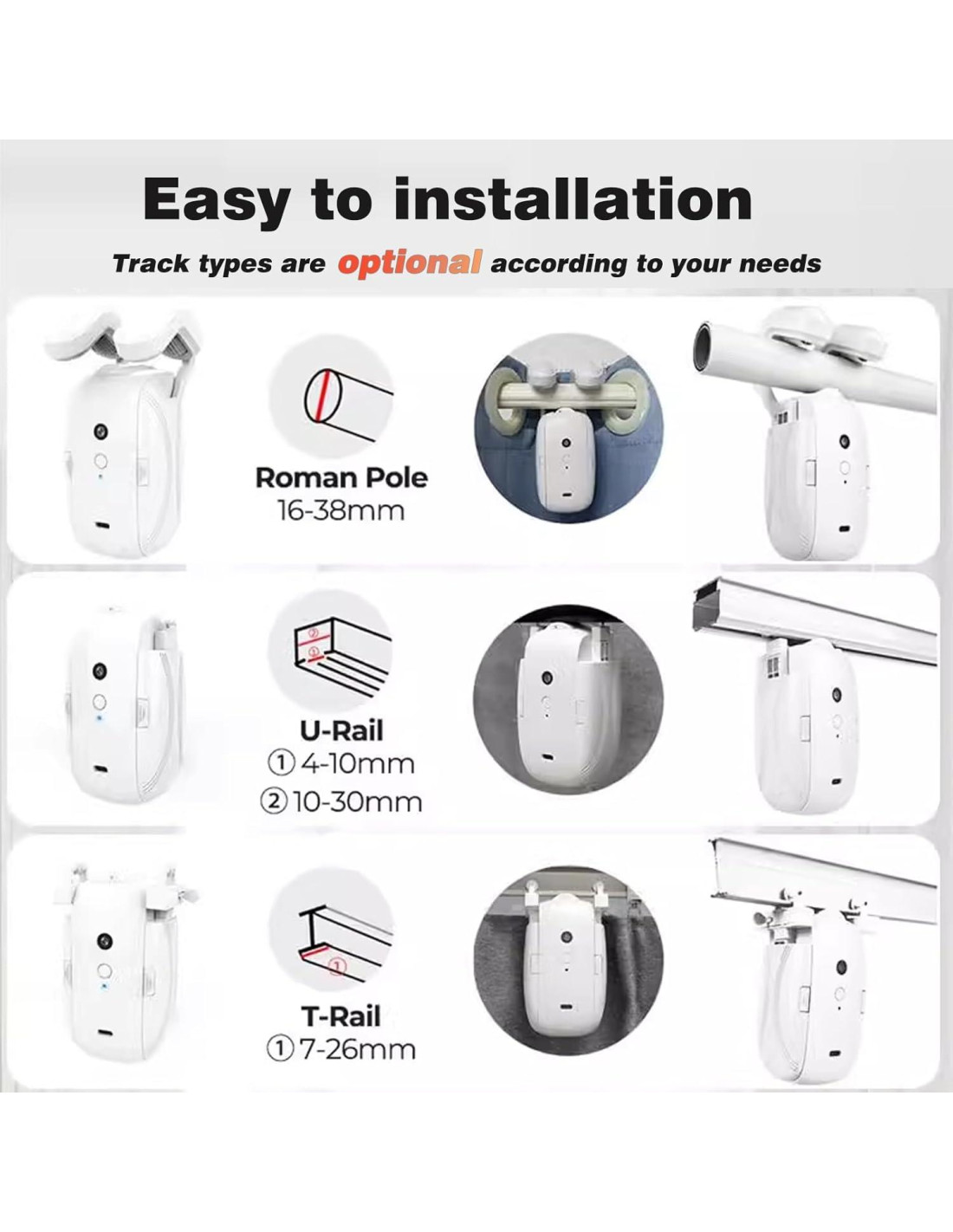 - [Nota 1] : 1 en venta, solo puede controlar cortinas de un lado. Si tu hogar tiene una Varilla Romana, por favor compra la Máquina de Cortinas de Varilla Romana (Solo para Varilla Romana), si tu hogar tiene un riel U o T, por favor compra el riel (Solo para rieles T/U)." para varilla romana/trayecto T/U 3 en 1 "Adecuado para varilla romana/trayecto T/U, 3 tipos de rieles de cortinas.