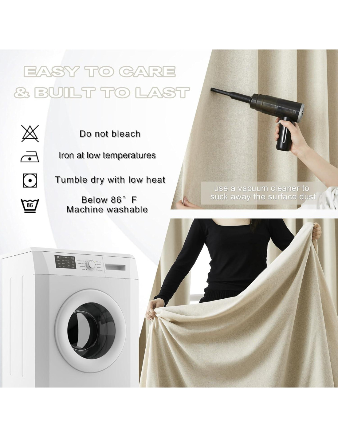 - Fácil Cuidado: Lavar a máquina en frío. Ciclo suave. No usar blanqueador. Usar una aspiradora para limpiar la superficie de las cortinas para prevenir la acumulación de polvo. Planchar al vapor desde la parte trasera cuando sea necesario. Planchar a baja temperatura. No planchar sobre la película negra interior de las cortinas, para evitar malentendidos innecesarios.