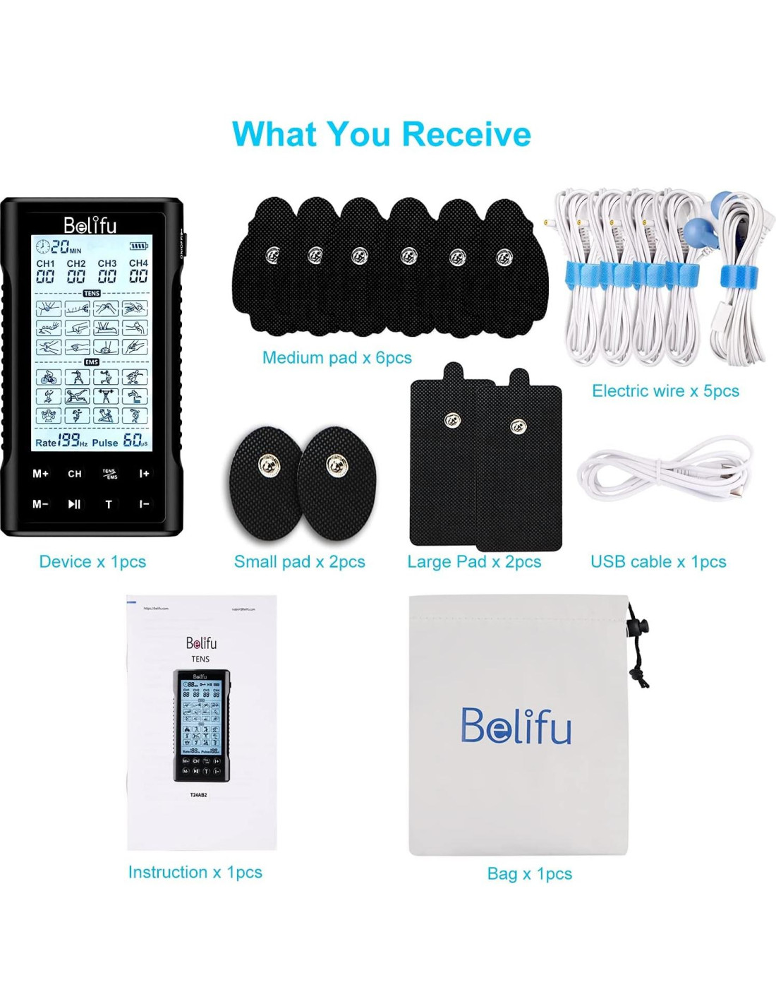 - MULTIFUNCIONAL CON 24 MODOS: Masajeador TENS multifuncional con 24 modos de masaje preprogramados, 30 niveles de intensidad para alivio del dolor y muscular. La unidad TENS ayuda a reducir el dolor y los espasmos musculares causados por una amplia gama de condiciones incluyendo: artritis, dolor menstrual, dolor de rodilla, dolor de cuello, dolor de espalda, lesiones deportivas. El Estimulador Muscular Belifu es una poderosa arma en tu lucha contra el dolor crónico. El Mejor Regalo para el Día del Padre