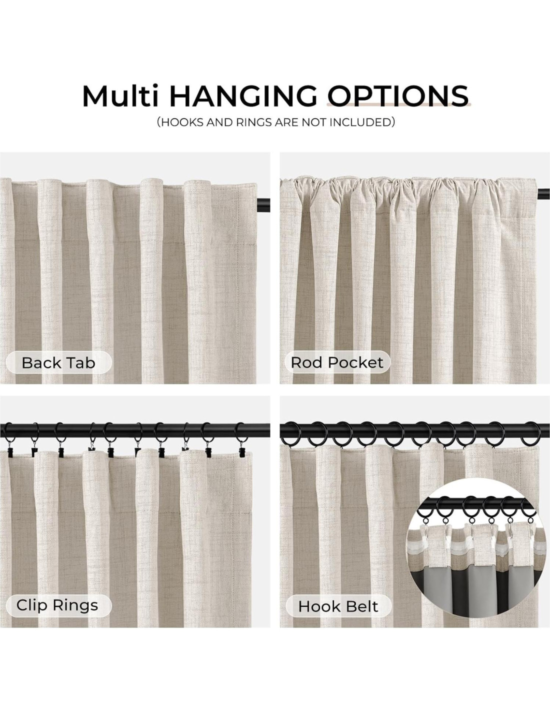 - Efecto 100% Opaco: Cortinas opacas 100%. Nuestras cortinas de lino opacas están hechas de un suave y texturizado tejido de lino, añadiendo un forro opaco del 100%, lo que hace que las cortinas sean suaves pero lo suficientemente gruesas como para mantener completamente fuera la luz solar, ofreciéndote una habitación realmente oscura. Perfecto para que los niños duerman más tiempo y para siestas durante el día; los trabajadores nocturnos podrán dormir bien incluso durante el día; los durmientes sensibles a la luz también pueden despertarse de forma natural y sentirse bien descansados.