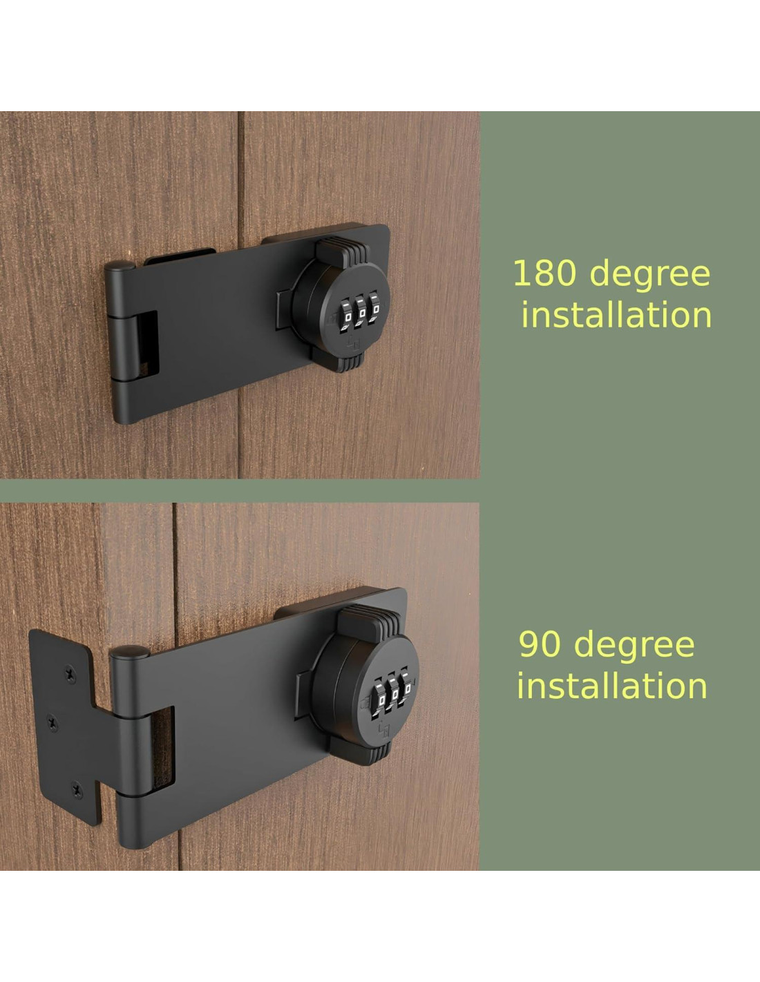 - Contraseña Numérica de 3 Dígitos: El sistema de 3 dígitos de nuestro pestillo de puerta permite hasta 1000 combinaciones diferentes que puedes establecer para disfrutar de la máxima seguridad y proteger tus objetos de valor.