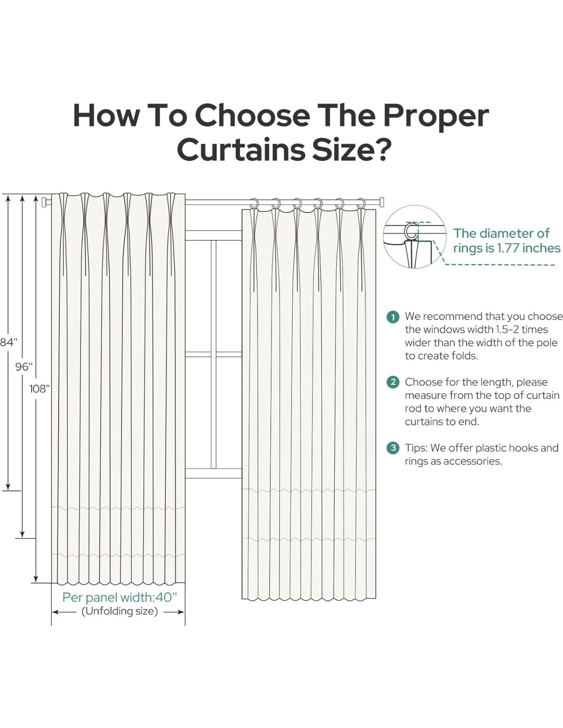 - [INCLUYE PAQUETE] Cada paquete incluye 2 paneles de cortinas plisadas, viene con 20 ganchos de plástico ajustables y 16 anillos, se puede ajustar la longitud del suelo de la cortina según su preferencia. Cada panel mide 40"W x 84"L, total 80"W x 84"L.