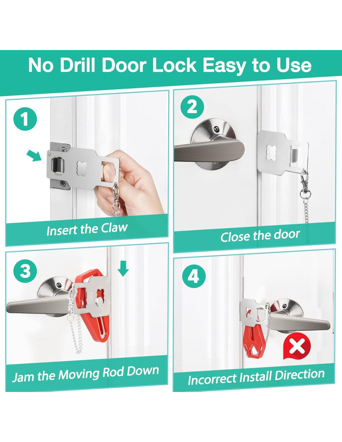 - FÁCIL DE USAR Y DISEÑO MÁS SEGURO: Las cerraduras de puerta portátiles para dormitorios no necesitan clavos ni tornillos, solo coloque la parte metálica en el agujero del marco de la puerta, luego cierre la puerta, tome el mango rojo e insértelo en la cerradura en su lugar, entonces nadie podrá entrar y en caso de emergencia podría quitar la cerradura en segundos en la oscuridad. Agregue cerraduras de seguridad para puertas desde el interior para proporcionar una fuerte sensación de seguridad