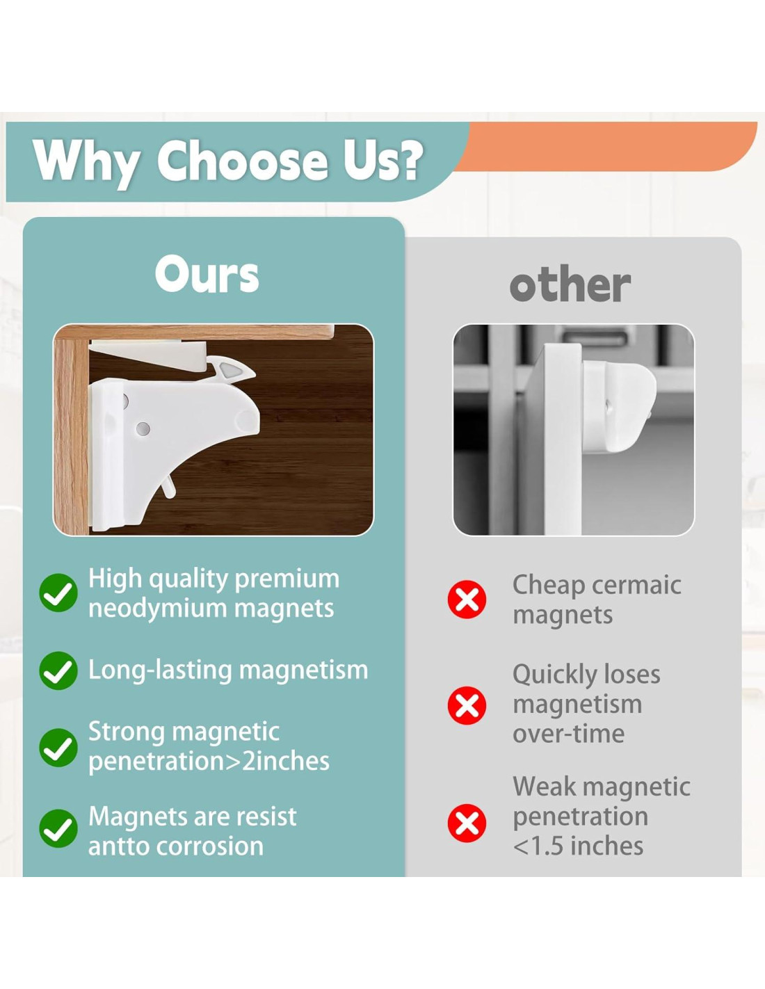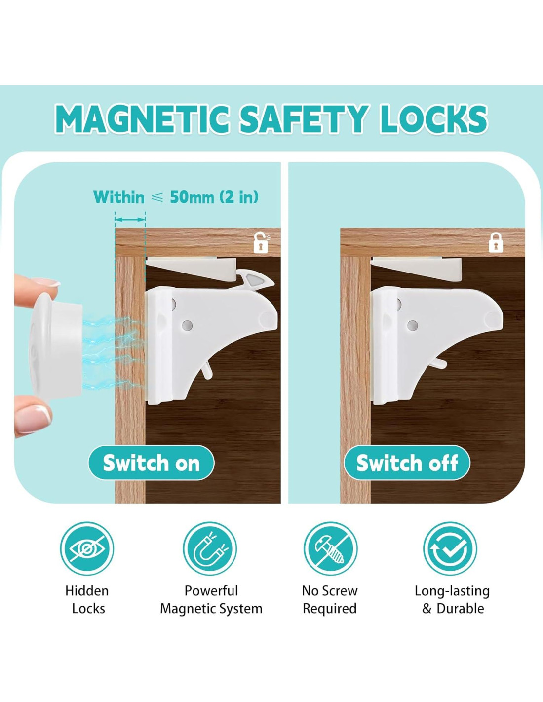 - Cerraduras a prueba de niños para gabinetes Diseño: La cerradura magnética es adecuada para puertas de gabinete con un grosor máximo de 5.08 cm. Las cerraduras a prueba de bebés se integran perfectamente con su decoración existente. Úselas en la cocina, baño, despensa, área de almacenamiento y dormitorio. Puede prevenir que un perro decidido de 11.34-13.61 kg acceda a los gabinetes. El diseño discreto asegura que sus gabinetes y cajones mantengan una apariencia limpia y ordenada.