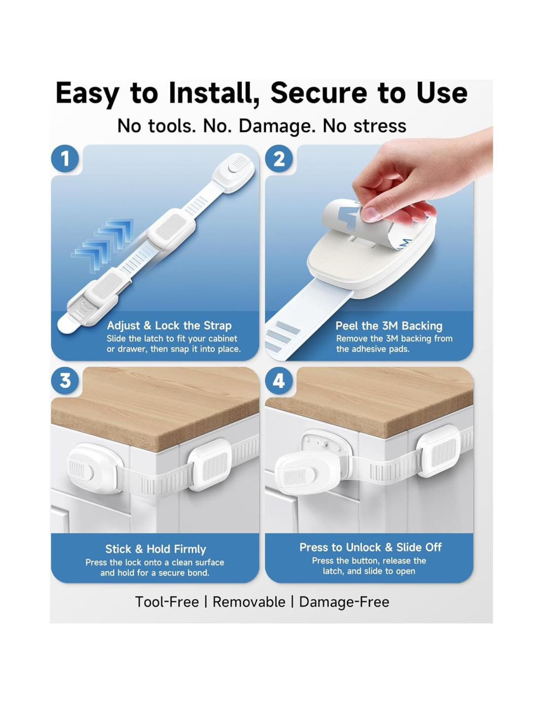- Diseño duradero y seguro: Hechas de materiales de alta calidad y no tóxicos, estas cerraduras para niños están diseñadas para durar y mantener los gabinetes, cajones, armarios, refrigeradores, hornos y botes de basura cerrados de manera segura, asegurando tranquilidad para los padres