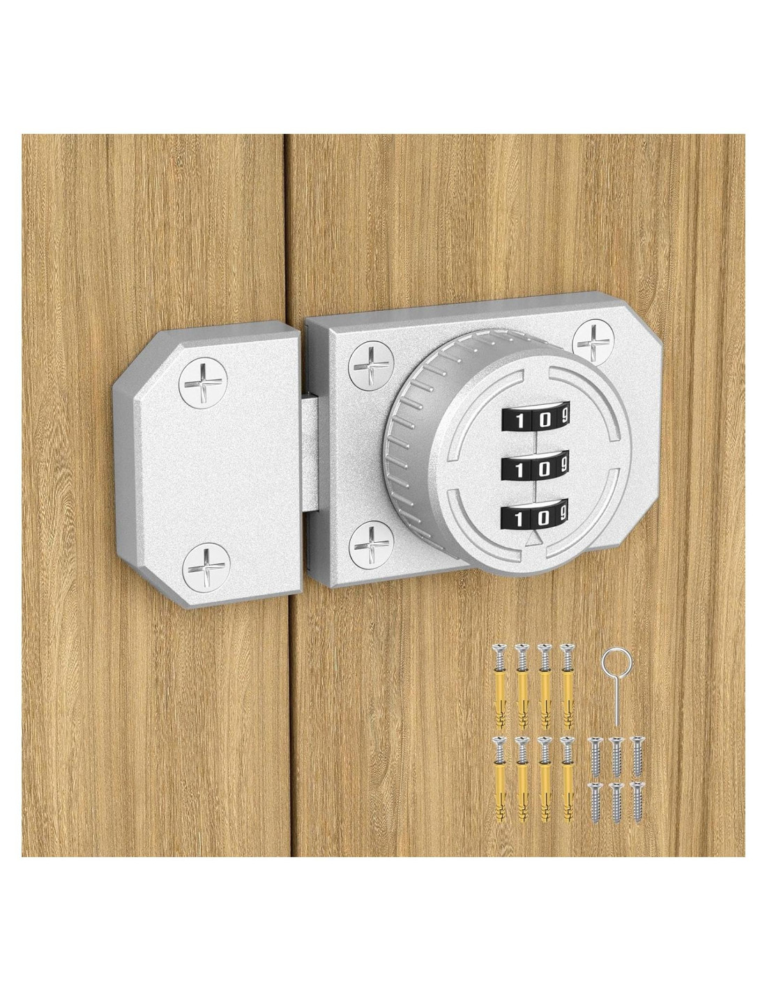 - Componentes incluidos: Cerradura de Combinación, Tornillos