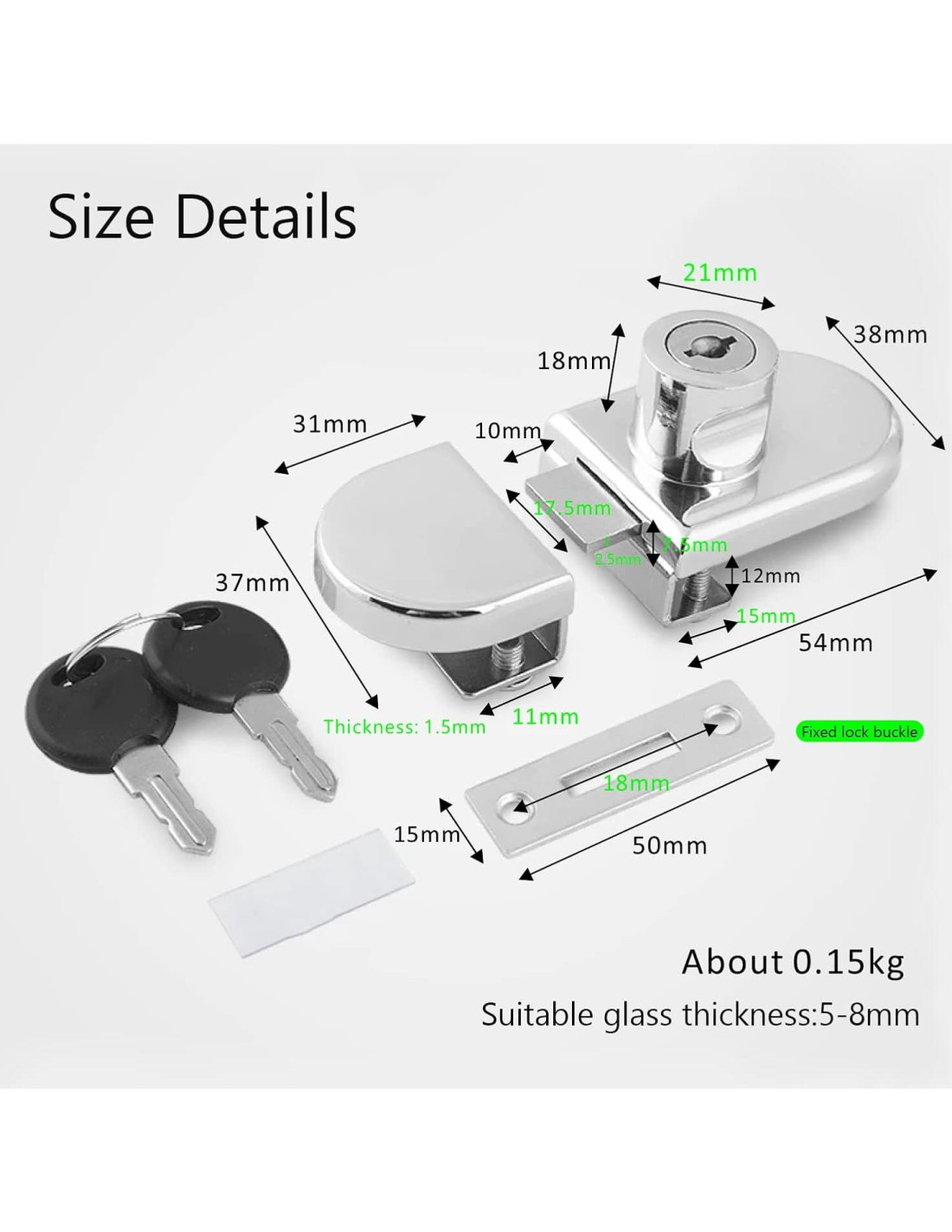 - Tamaño: 53x37mm (2.1''x1.5''), para grosor de vidrio: 5-8mm (0.2'' - 0.31''); Adecuado para cerradura de puerta doble.