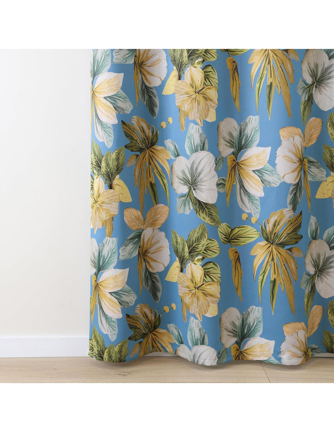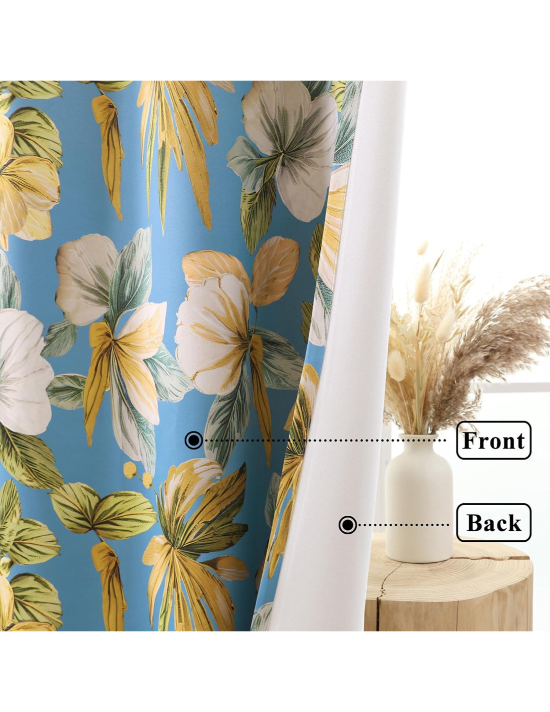 - Hermoso diseño: El lado frontal de las cortinas (facing the room) presenta un delicado patrón floral amarillento sobre un fondo azul cielo relajante. La tela es excepcionalmente suave al tacto. Con un grosor medio, estas cortinas combinan estilo y practicidad, ofreciendo un poco de aislamiento térmico para tu habitación. Cuelgan y drapean elegantemente, mientras que el lado trasero es de un blanco natural sin blanquear.