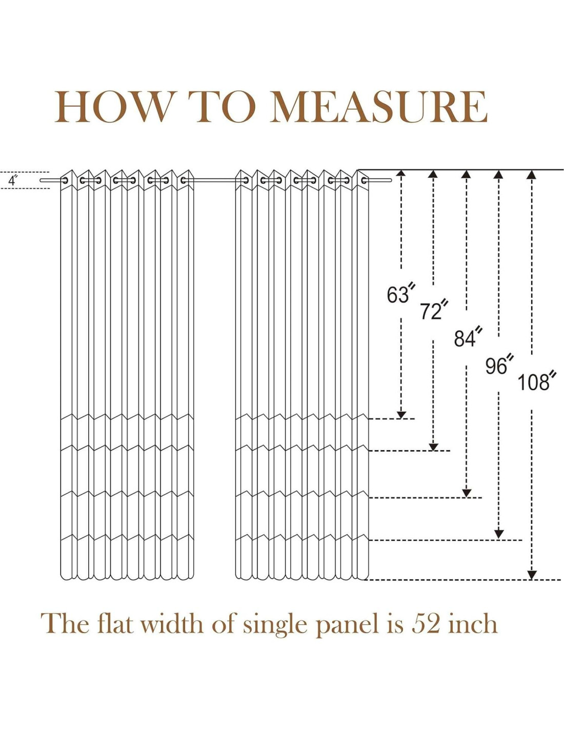 - Paquete: Set de 2 paneles. Cada panel de cortina está cuidadosamente cosido, tiene un ancho de tela de 52" y una longitud total (incluyendo ojetes) de 63", 72", 84", 96", 108" y 120". Adecuado para decorar tu dormitorio, sala de estar, comedor, guardería, etc.