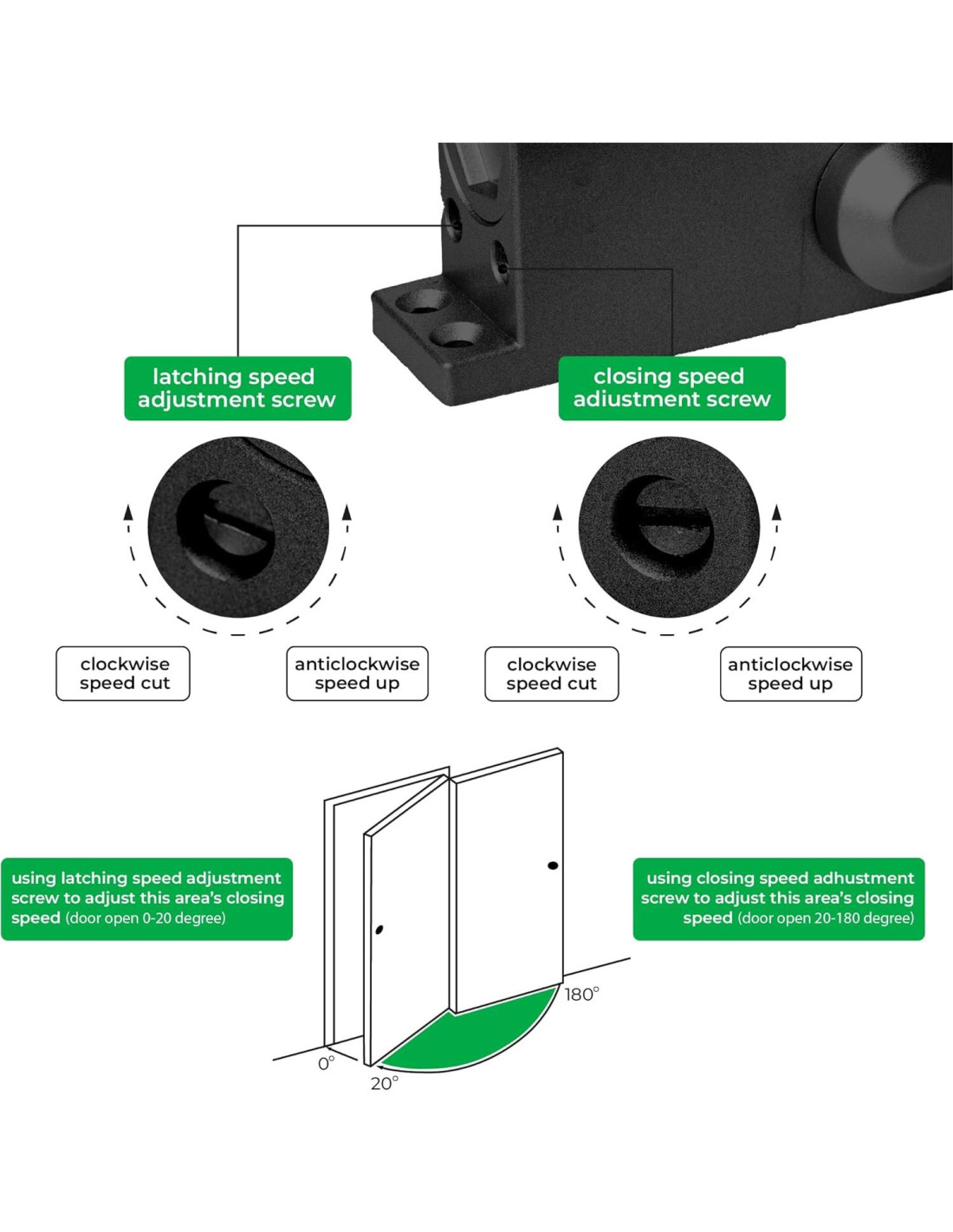 - Fuerza lista para el clima - Diseñada para -42C a 55C y puertas de 45-66 kg; cuerpo de zinc y aluminio fundido se adapta a cualquier puerta utilizando resortes para cerrar la puerta