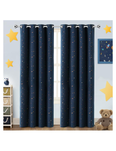 - BIEN HECHO: Cada paquete contiene 2 paneles de cortinas blackout con estrellas brillantes para la habitación de los niños. Con hilos recortados y sin arrugas, cada panel está construido con 8 ojales anti óxido que se ajustan bien a varillas de cortina de hasta 1 1/2 pulgadas (3,81 cm) para una fácil instalación y deslizamiento
