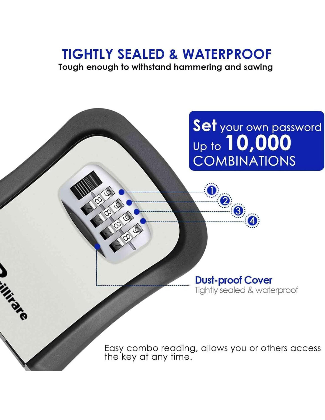 - GRAN CAPACIDAD: Nuestro locker de llaves incluye una cubierta protectora para ocultar y proteger los diales del polvo, óxido, luz solar, lluvia y nieve. Está sellado herméticamente e impermeable, te brinda un gran espacio interno para sostener hasta 5 llaves de casa (más cortas que 3.35 pulgadas (8,51 cm))