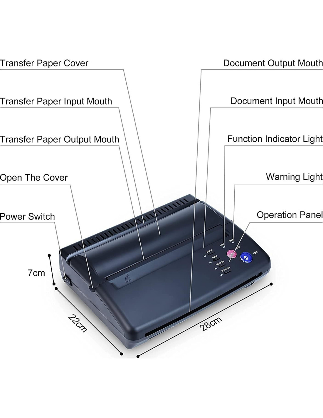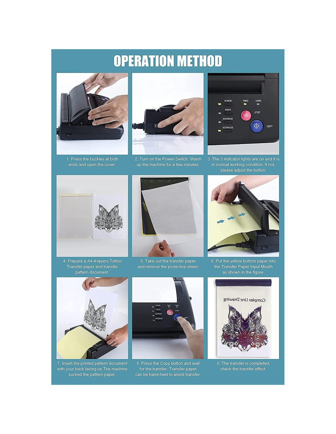 - [Notas del Producto] La máquina de transferencia funciona bien en líneas y sombras simples, pero no es adecuada para patrones de sombras complejas, necesita ser ajustada por el artista del tatuaje más tarde. Para proteger la máquina y evitar atascos de papel, por favor no transfieras continuamente, enfría después de un uso prolongado. Cuando el patrón transferido tiene líneas negras, por favor abre la tapa de la máquina y limpia la cabeza de impresión y el rodillo.