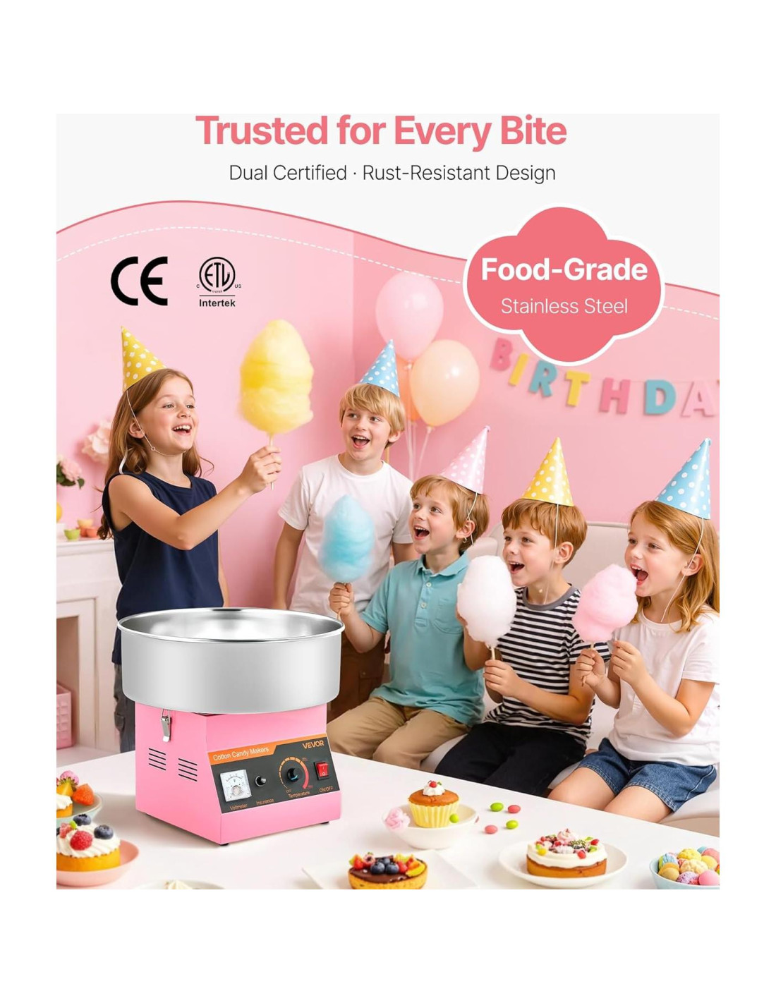 - Materiales Premium de Grado Alimenticio: Nuestra máquina de algodón de azúcar tiene una placa de acero inoxidable SUS201, cabeza de aluminio de grado alimenticio, cuerpo recubierto a prueba de óxido. Los componentes cumplen con los estándares para uso familiar