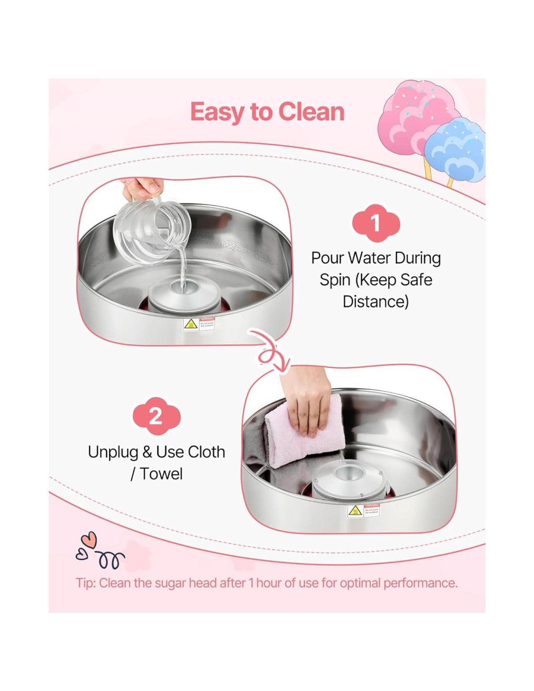 - Limpieza Fácil en 1 Minuto: Vierte agua durante la operación (mantén la distancia adecuada), la cabeza de azúcar gira para eliminar los restos. Limpieza de 1 minuto después de 1 hora de uso-sin herramientas necesarias, evita la pérdida de piezas, mantiene el fabricante de algodón de azúcar listo para el próximo uso