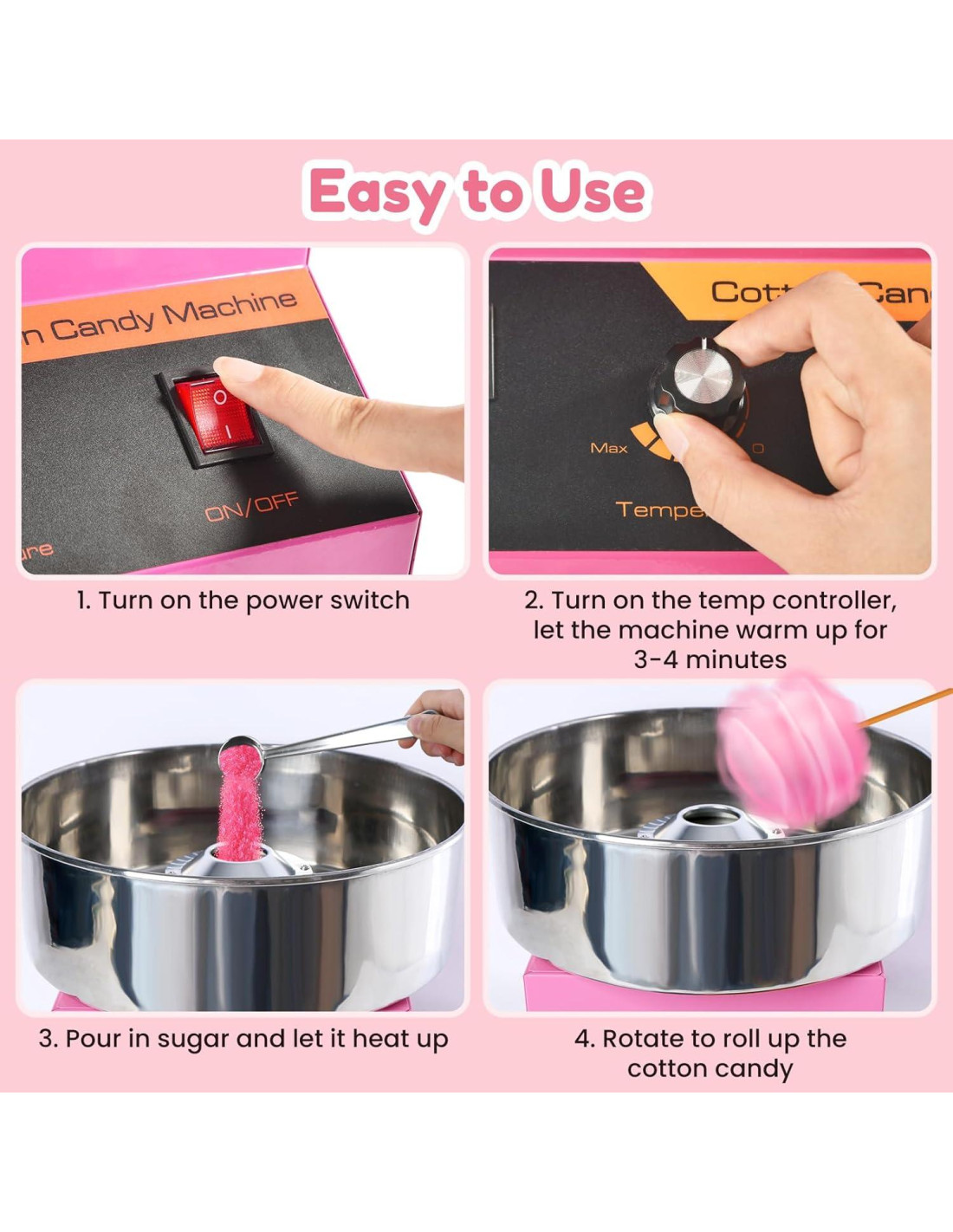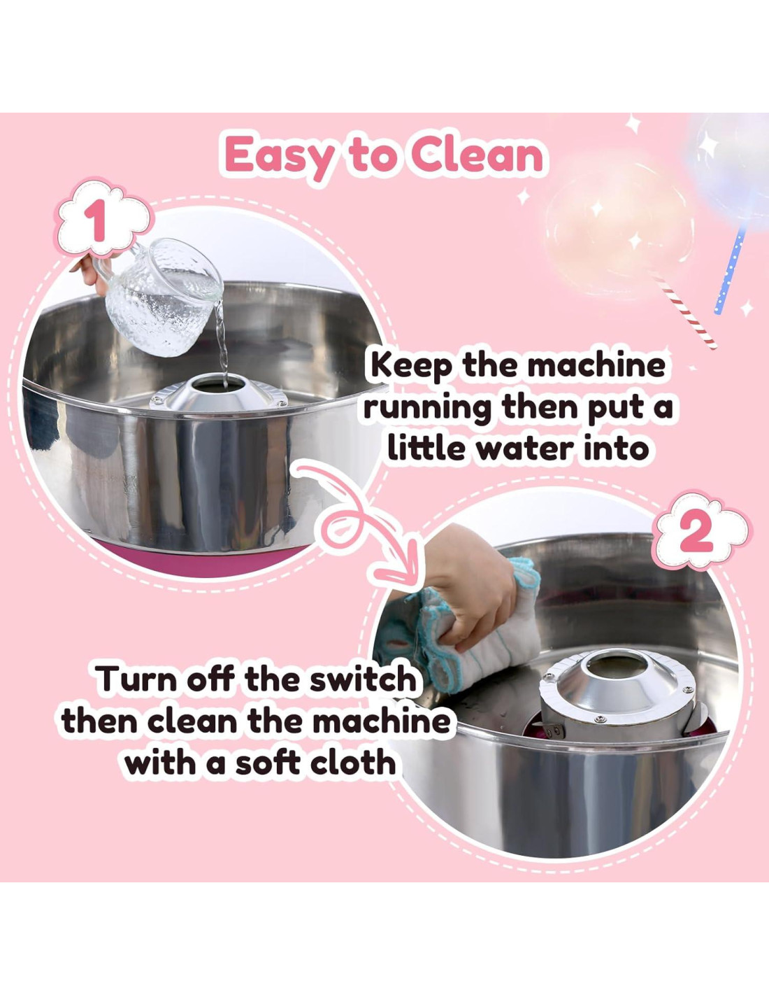 - Hacer algodón de azúcar con nuestra máquina se ha vuelto fácil. Simplemente enciende el botón de encendido, ajusta la perilla de temperatura, calienta durante 3-4 minutos, vierte azúcar en la cabeza giratoria y usa los palitos para recoger los algodones de azúcar. El gran tazón de la máquina es desmontable y se puede limpiar fácilmente con agua o un paño húmedo.