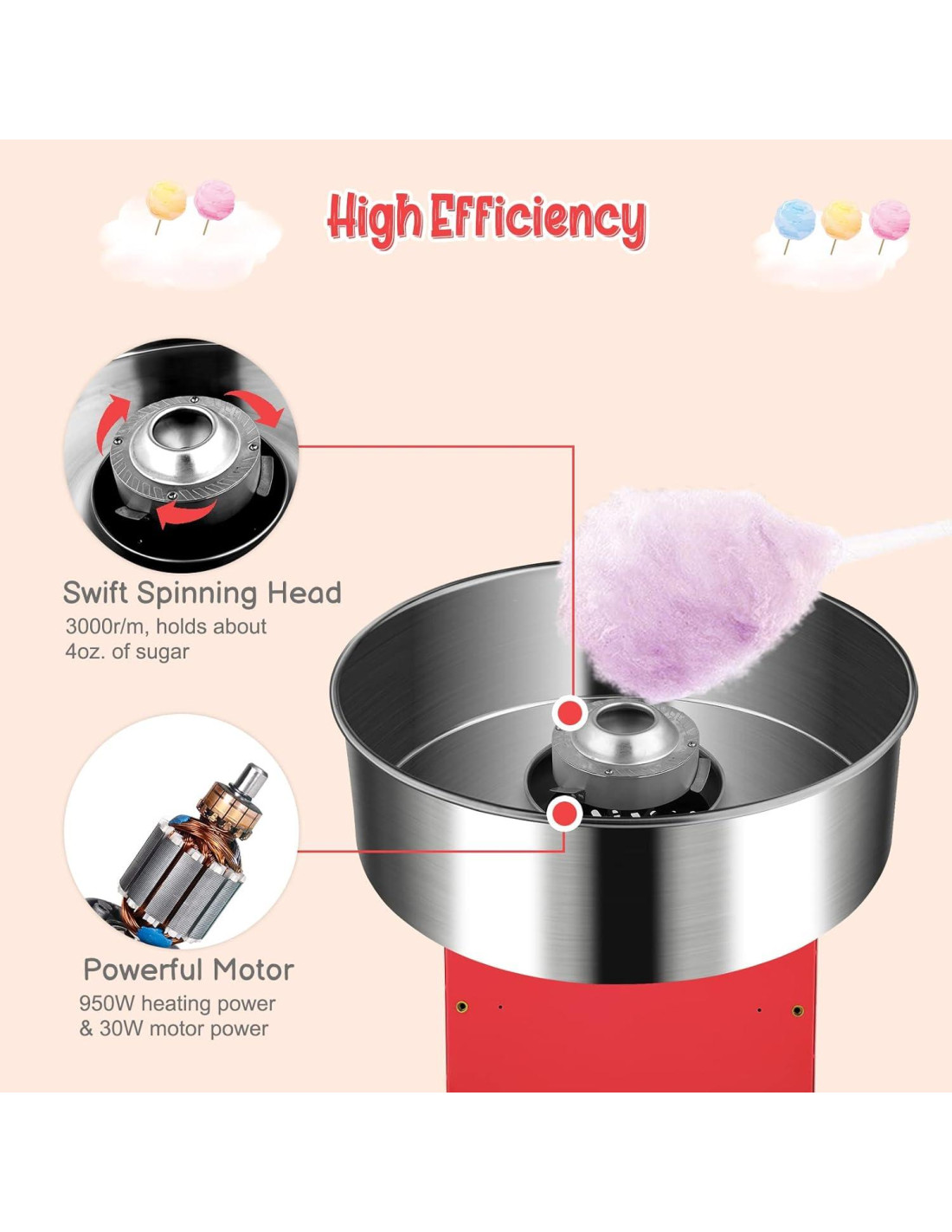 - Potente Motor de 980W--Equipado con un motor de alto rendimiento de 980W, esta máquina eléctrica de algodón de azúcar gira el azúcar rápida y eficientemente, produciendo algodón de azúcar consistente que se derrite en la boca. Su diseño duradero asegura un funcionamiento confiable, lo que la hace ideal tanto para uso casual como para eventos más grandes.