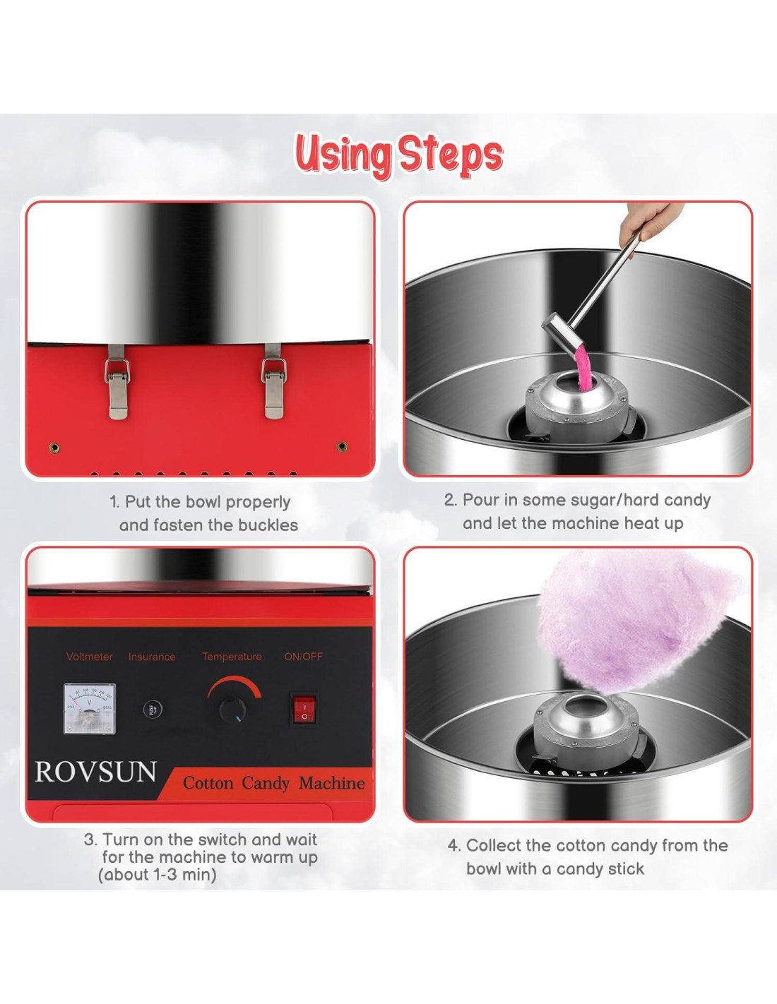 - Seguro y Amigable para el Usuario--La seguridad es una prioridad con características como el escudo de burbujas, mangos de tacto frío y una base robusta y antideslizante. Fácil de limpiar y operar, esta máquina de algodón de azúcar es perfecta para familias, negocios o cualquier persona que busque una forma divertida y segura de hacer algodón de azúcar.