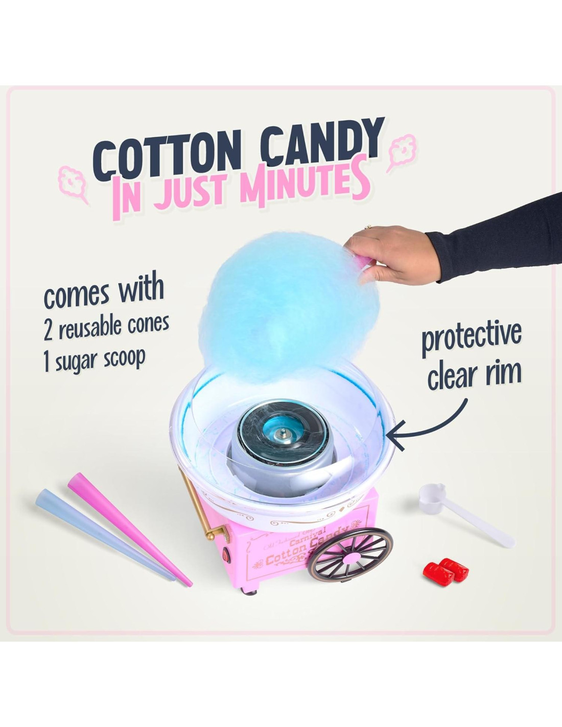 - ACCESORIOS Y CARACTERÍSTICAS: Viene con suministros esenciales para la máquina de algodón de azúcar, incluyendo dos conos reutilizables, un cucharón de azúcar y una cabeza extractora. Los pies con ventosas proporcionan estabilidad adicional y la unidad se desarma fácilmente para una limpieza rápida.