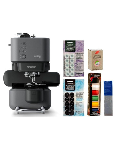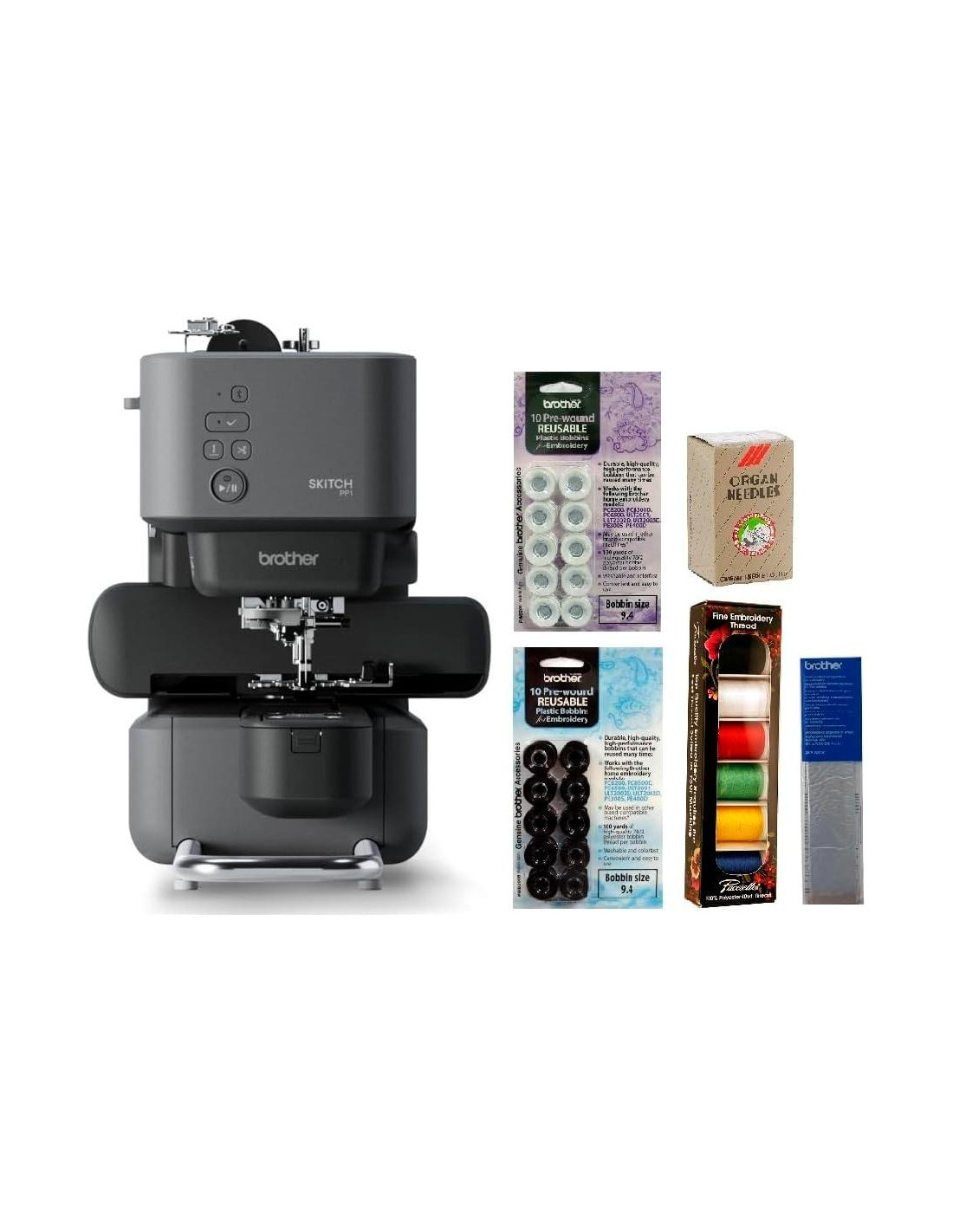Brother PP1 Skitch Máquina de Bordar de Aguja Simple y Juego de Hilo de 6 Piezas, 20 Bobinas, 100 Piezas de Agujas de Bordar 75/11, Rollo de Estabilizador