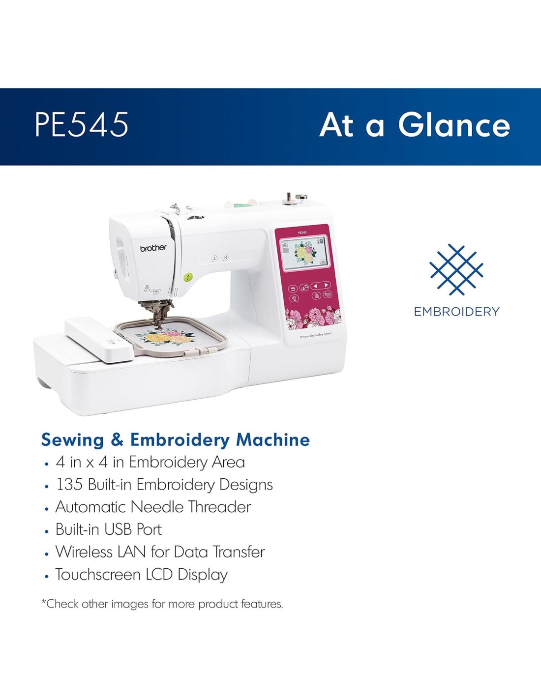 Ya seas un experto o un principiante, encontrarás un valor increíble y facilidad de uso con la Brother PE545. Esta máquina ofrece múltiples características de bordado personalizadas que ayudan a que el bordado sea fácil y divertido. La PE545 cuenta con un área de bordado de 4" x 4" (10 x 10 cm), 135 diseños de bordado incorporados, 10 patrones de marco y 10 estilos de fuente únicos para letras y monogramas. La máquina de bordar PE545 también incluye una función de memoria incorporada que te permite importar diseños desde una memoria USB a través del puerto USB. La máquina de bordar Brother PE545 está construida con una gran pantalla táctil LCD a color que te permite ver tus diseños en color antes de coserlos. Además, una característica única de Arrastrar y Soltar Patrones de Bordado te permite mover y posicionar tu diseño de bordado en la pantalla de color con solo tocarlo con tu dedo. También se incluyen con esta máquina de bordar videos tutoriales y un sistema fácil de enhebrado de aguja para ayudarte a comenzar. Los proyectos de bordado son simples con la Brother PE545. Puedes agregar fácilmente nuevos y elegantes adornos a la ropa en tu armario, personalizar las pertenencias de un niño con diseños y letras personalizadas, o convertir almohadas y mantas cotidianas en regalos personalizados para amigos y familiares. Esta máquina de bordar incluye un manual de usuario multilingüe (inglés, español y francés) y una garantía limitada de 25 años, además de soporte técnico durante la vida del producto. Avisos: (1) La compatibilidad puede variar según el dispositivo y el sistema operativo. Requiere conexión a una red inalámbrica.