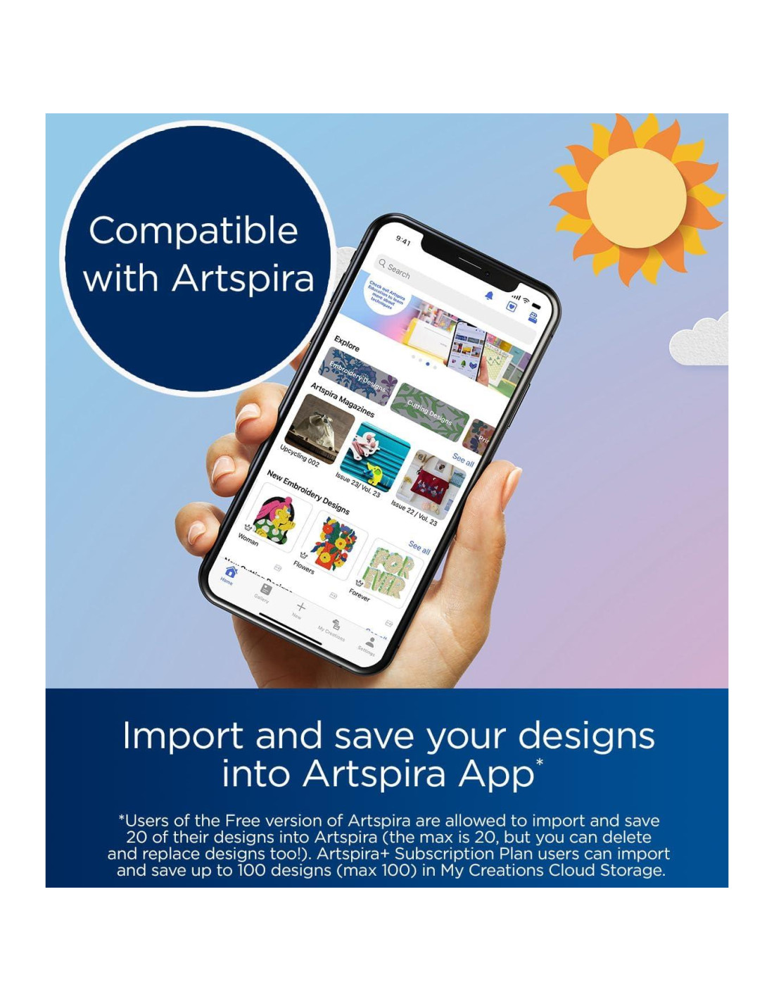 - APLICACIÓN MÓVIL ARTSPIRA: Crea patrones de bordado personalizados dibujando en tu dispositivo móvil, o descarga patrones de la colección y transfiérelos a tu PE545 de forma inalámbrica