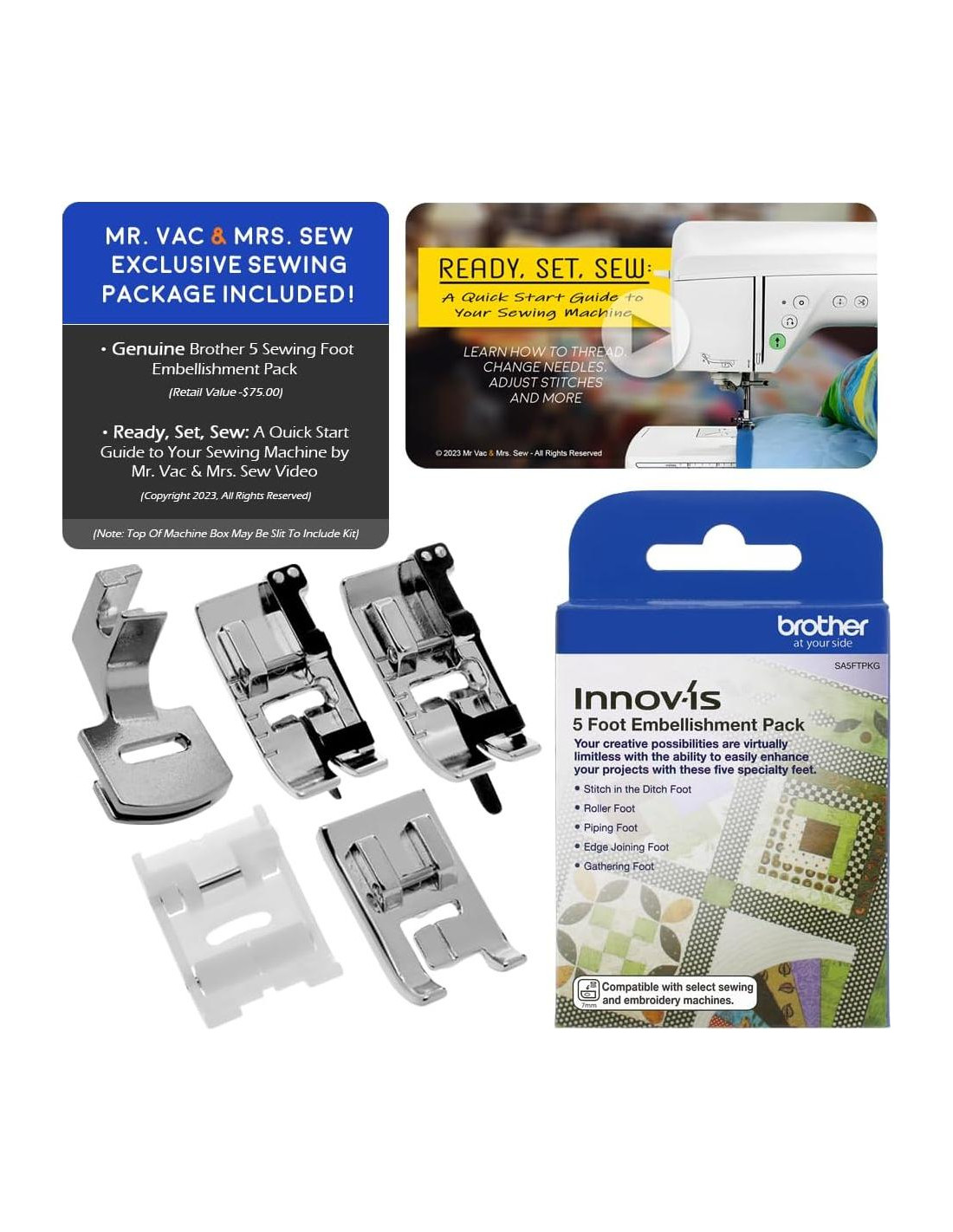 - Incluye Paquete de Embellecimiento de 5 Pies Originales Brother - Tus Posibilidades Creativas son Virtualmente Ilimitadas con la Capacidad de Mejorar Fácilmente tus Proyectos con los Cinco Pies Especiales Incluidos. El Paquete incluye un Pie para Costura en la Costura, Pie Rodante, Pie para Piping, Pie para Unir Bordes y Pie para Fruncir (Valor de Venta - 75.00$)