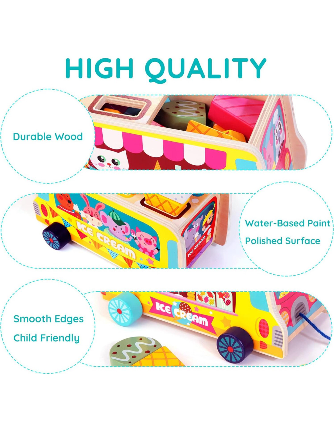 - Multi-función y Almacenamiento Fácil 6 agujeros en la parte superior para que los niños coloquen y promuevan helados cuando manejan una pequeña heladería, camión con ruedas y cuerda de tiro para simplemente tirar y avanzar. Después de las horas, coloca todos los bloques de helado en el camión para un fácil almacenamiento.