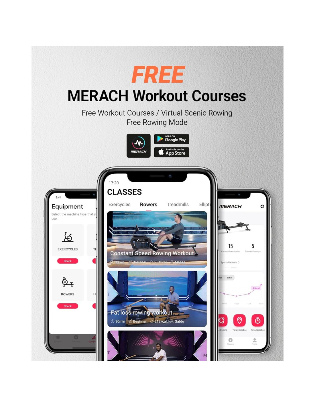 - APP MERACH GRATIS: Nuestra App exclusiva te ofrece una variedad de clases de ejercicio gratuitas dirigidas por entrenadores y personaliza todo tu programa de fitness. Combinando métodos HIIT, rastrear tu progreso en remo es simple con métricas en tiempo real como distancia, tiempo, calorías, BPM promedio y más. También es compatible con la APP KINOMAP.