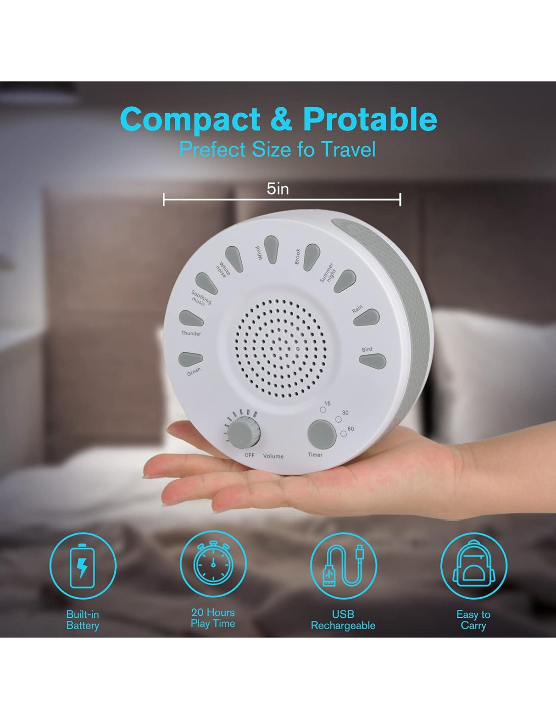 - Programación de Sueño Inteligente Hecha Simple - Temporizador personalizable de 15/30/60 minutos previene el funcionamiento toda la noche. Presenta botones táctiles amigables con el modo oscuro y opciones de energía dual (adaptador AC o 4 baterías AA) para un uso ininterrumpido durante cortes de energía o vuelos de costa a costa.
