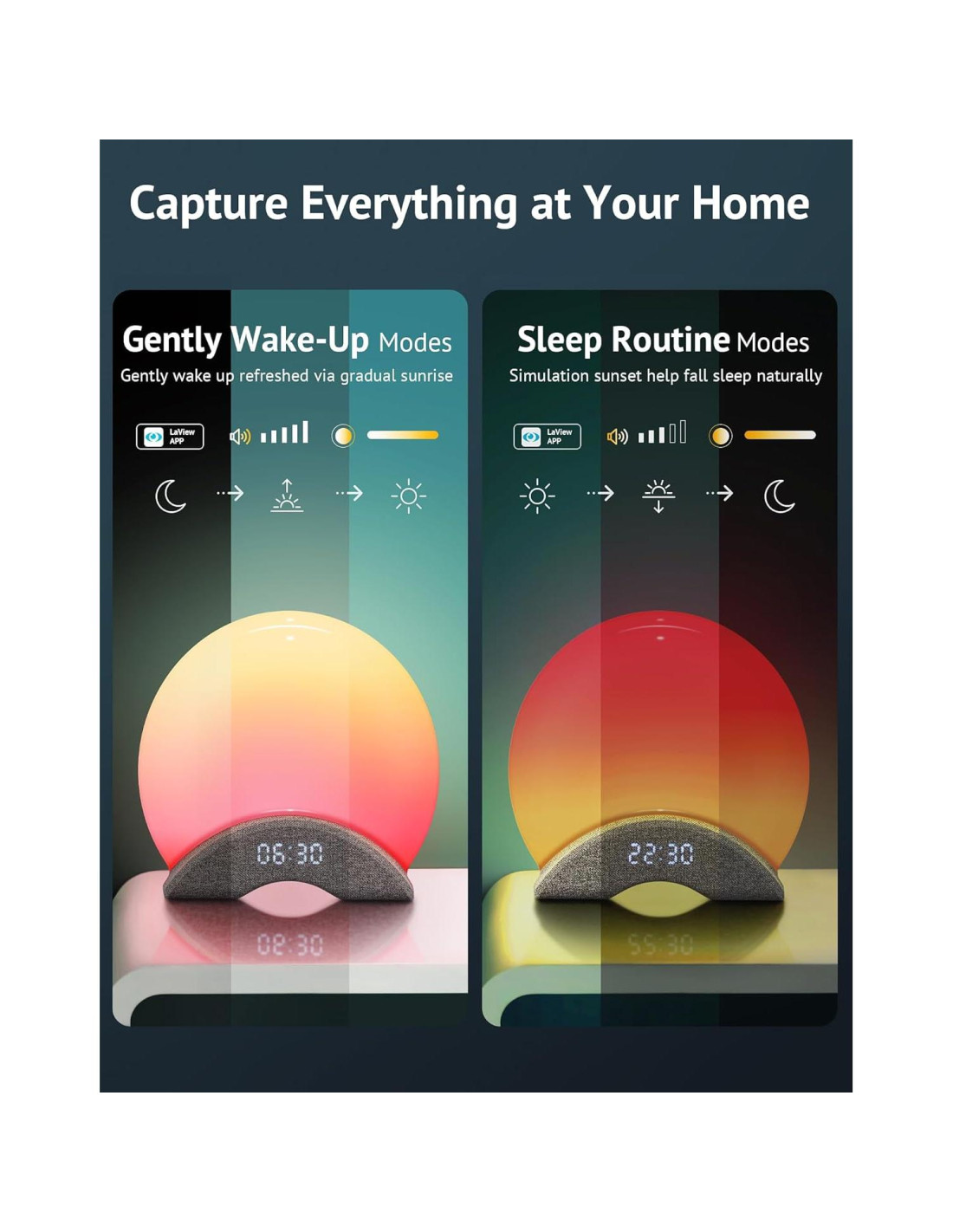 LaView Máquina de Ruido Blanco Inteligente, Control de App Máquina de Sonido para Dormir Luz Nocturna 25 Sonidos Relajantes y 8 Modos de Ritmo, Luz de Despertar al Amanecer, Reloj Despertador Inteligente para Niños/Adultos, Ideal para Regalo