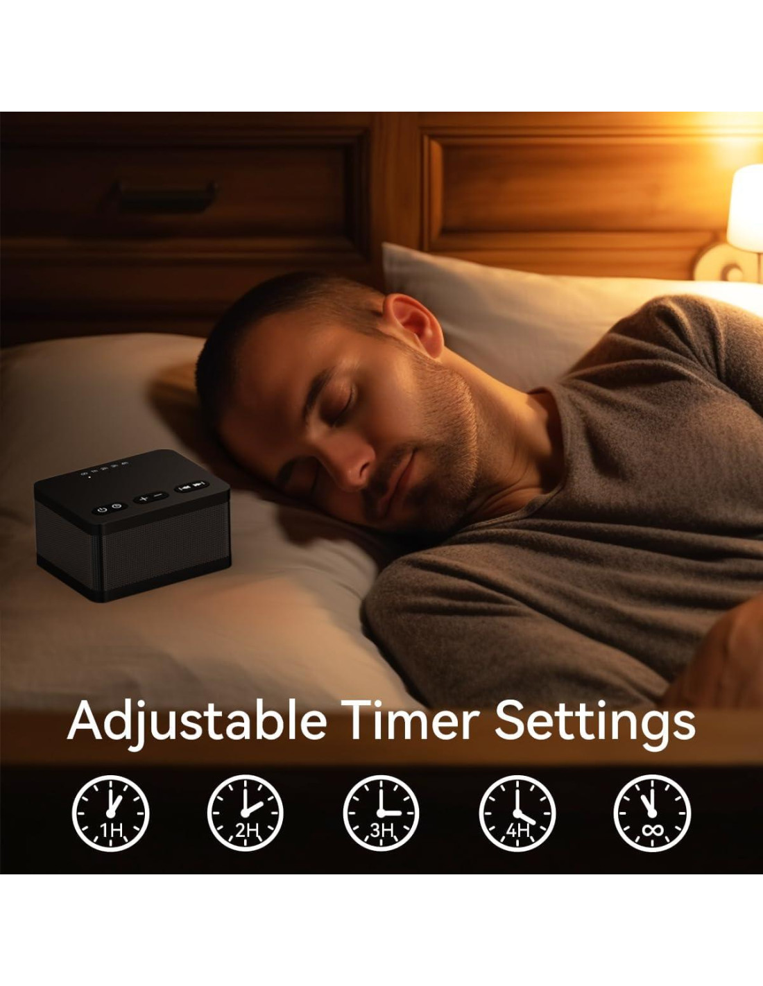 - [5 Temporizadores y Función de Memoria] La máquina de sonido tiene 5 configuraciones de temporizador, puedes establecer 1 hora, 2 horas, 3 horas, 4 horas y reproducción continua según tus necesidades. También recuerda y restaura el sonido y el nivel de volumen de la última reproducción cuando la usas la próxima vez.