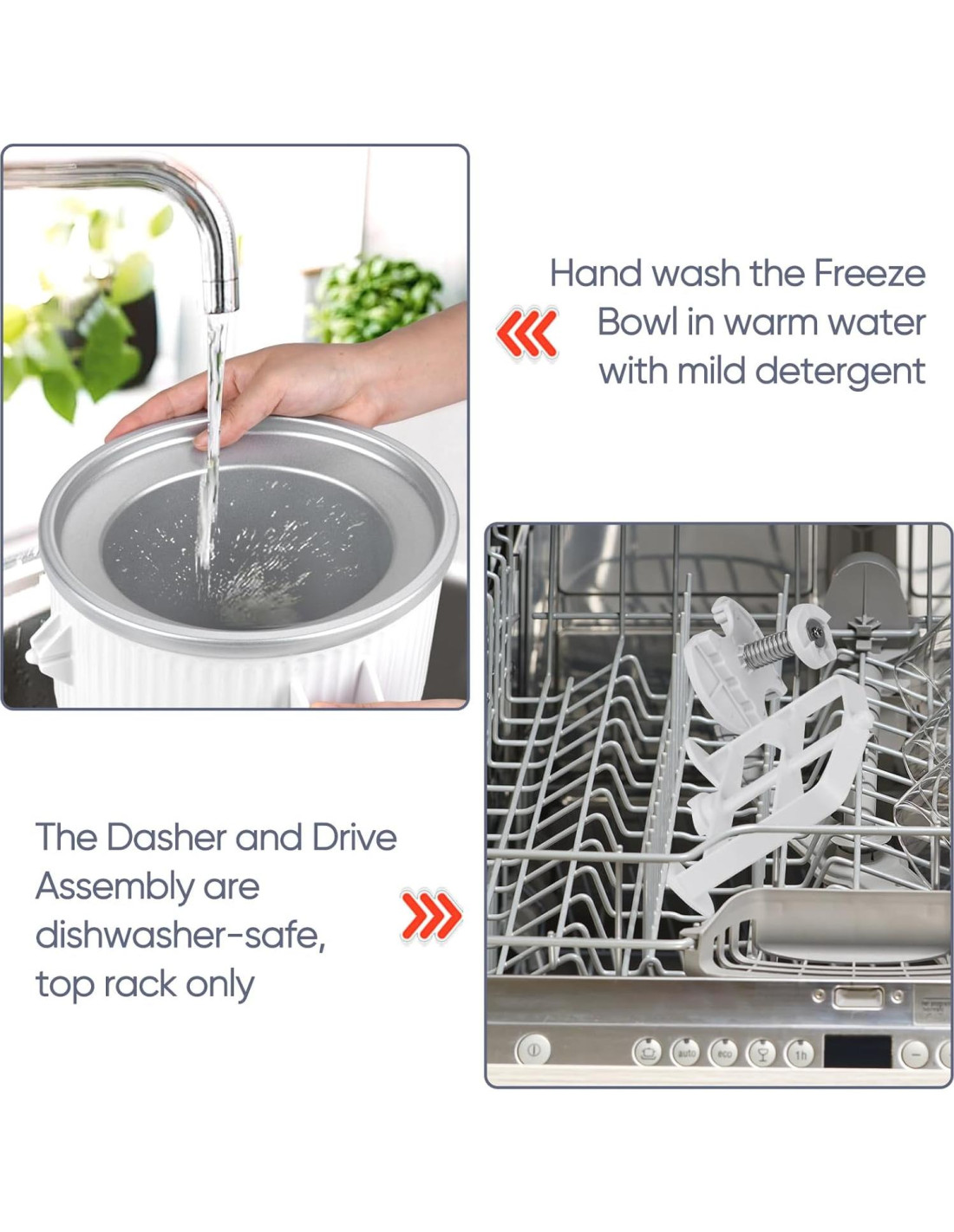 - El accesorio para helados para la batidora de pie KitchenAid tiene un mezclador y un ensamblaje de transmisión que es apto para lavavajillas en la "parte superior". Los tazones del congelador deben lavarse con agua y detergente suaves y secarse completamente antes de colocarlos en el congelador