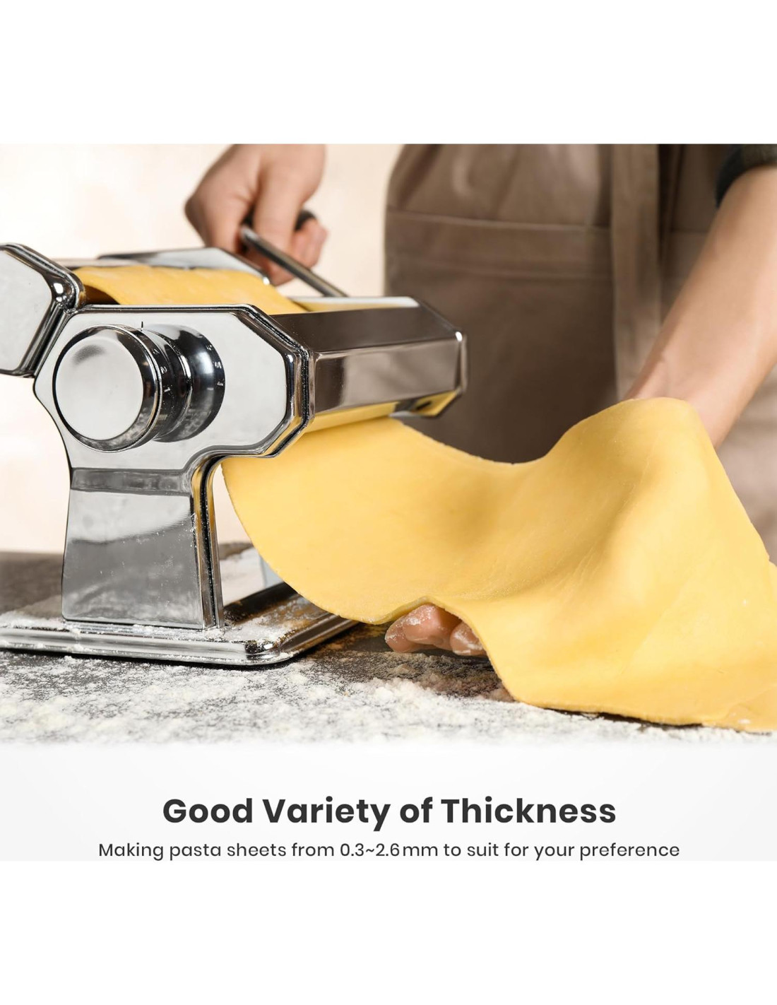 - CONFIGURACIONES DE GROSOR AJUSTABLES: El botón regulador con 9 configuraciones te permite elegir el grosor de tu hoja de masa, de 0.3 a 2.6 mm (0.01 a 0.1 in); cambia la textura y el sabor de tu pasta con este simple ajuste