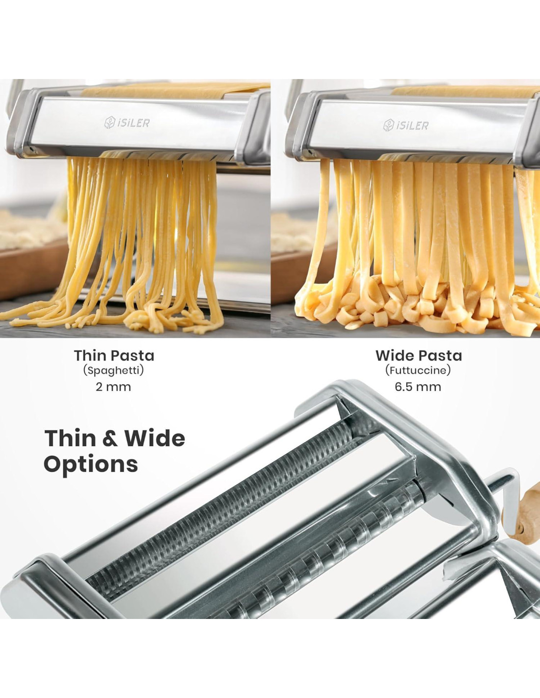 - 2 ANCHOS PARA VARIOS TIPOS DE PASTA: Usando su cortador único, las hojas de pasta pueden ser cortadas con uno de 2 anchos - 2 o 6.6 mm (0.07 in o 0.26 in); perfecto para hacer espagueti, fettuccini, lasaña, pieles de dumpling y más; satisface todas tus necesidades de fabricación de pasta