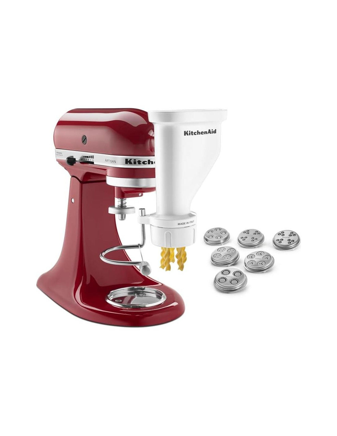 Impulsado por la batidora de pie KitchenAid, el accesorio de prensa de pasta gourmet hace 6 tipos de pasta fresca desde cero de manera rápida y fácil; espagueti, bucatini, fusilli, rigatoni, macarrones pequeños y grandes. Hecho en Italia. Para todo lo que quieras hacer. KitchenAid.