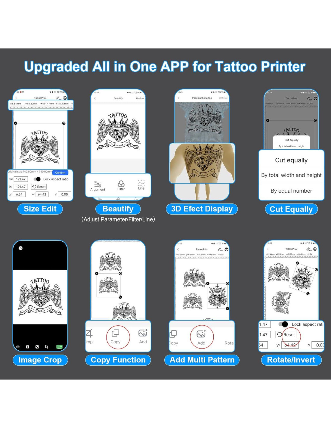 - Aplicación TATOPRT Potente: Di adiós al tedioso dibujo de plantillas y a los complicados procesos de impresión, nuestra aplicación TATOPRT permite la impresión de imágenes con un solo clic. Con funciones de ajuste de tamaño, modo de tablero de bocetos, agregar múltiples diseños, cortar de manera uniforme, visualización de efecto 3D, entre otros, puedes editar, agregar, ajustar y exportar imágenes de plantillas fácilmente según lo necesites.