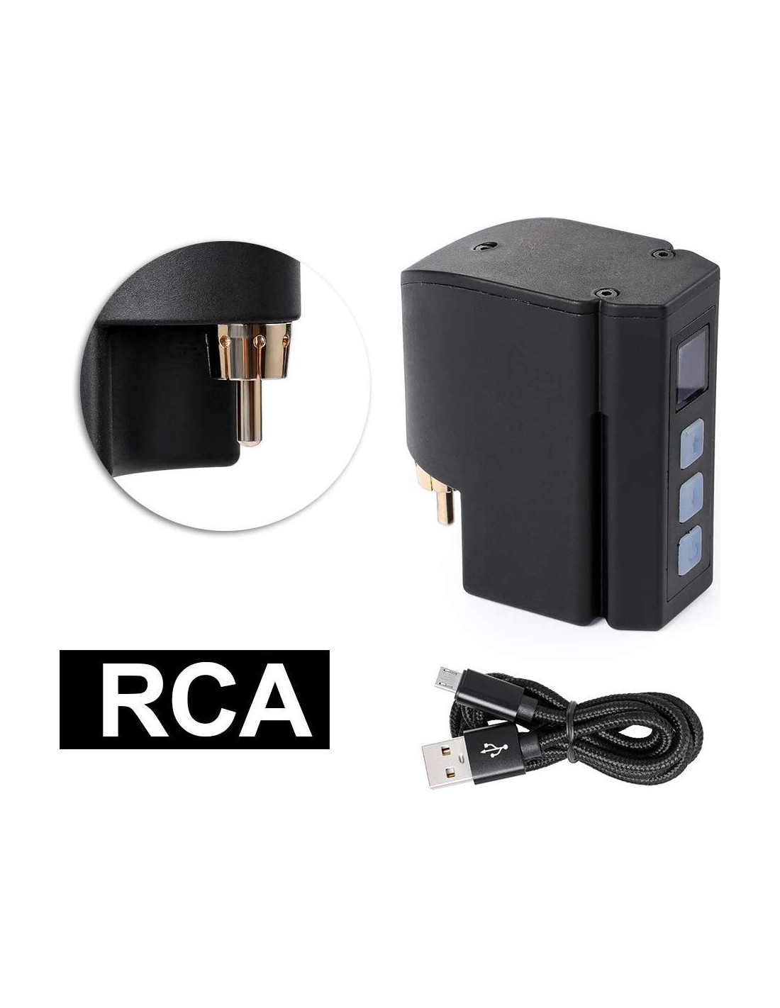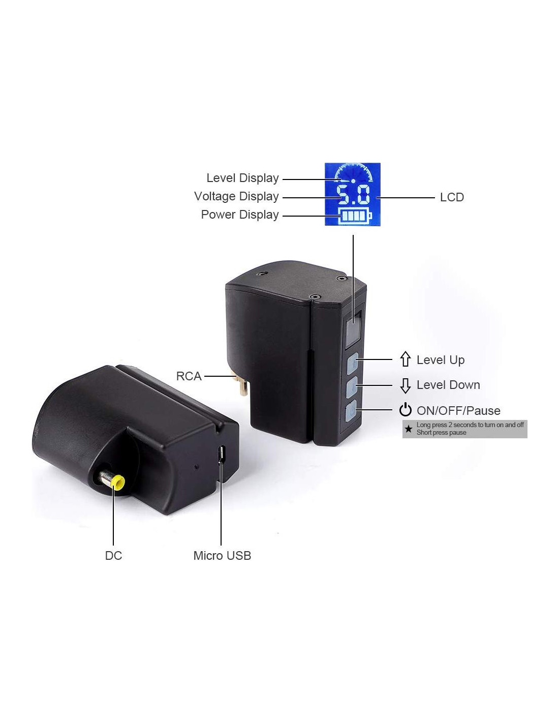 El artículo incluye: 1 x Batería de Litio RCA 5.5 1 x Cable de carga USB. Características: Aleación de Aluminio de Aeronave Cinco diferentes salidas de voltaje están disponibles para ajuste Parámetro de potencia: * Batería de litio * Tiempo de carga: 2 horas * Corriente en espera: 2A * Voltaje de operación: 3.7V * Voltaje de carga: DC 5V +/- 0.5V 1000mA. * Completamente cargada y completamente alimentada por 2-3 horas * Voltaje de salida: 1 Nivel: 5V, 2 Nivel: 6.5V, 3 Nivel: 8V, 4 Nivel: 9.5V, 5 Nivel: 11V. Nota: 1. Encendido/apagado (mantener presionado y luego encender). Nota: Cuando el bolígrafo no está conectado, se apagará inmediatamente después de encenderse por protección de energía. batería de potencia y panel de control, solo cuando el botón esté insertado en el bolígrafo.) 2. La carga está completa cuando el indicador de visualización de la batería muestra saturación. : 5 niveles más rápidos, 1 nivel más lento. Siempre que el dispositivo esté encendido, muestra directamente el Nivel 3, y el nivel trasero se muestra y se alterna con la visualización de la batería. 3. Visualización de carga: 25% a 100% 4 Pantalla LED, las luces del indicador parpadean cuando se carga. Cada vez, un cierto valor de voltaje corresponde a cada saturación de la visualización (25% a 100%), 4. Flechas Arriba y Abajo: Desplazamiento de Nivel (1 2 3 4 5 Desplazamiento de Voltaje).