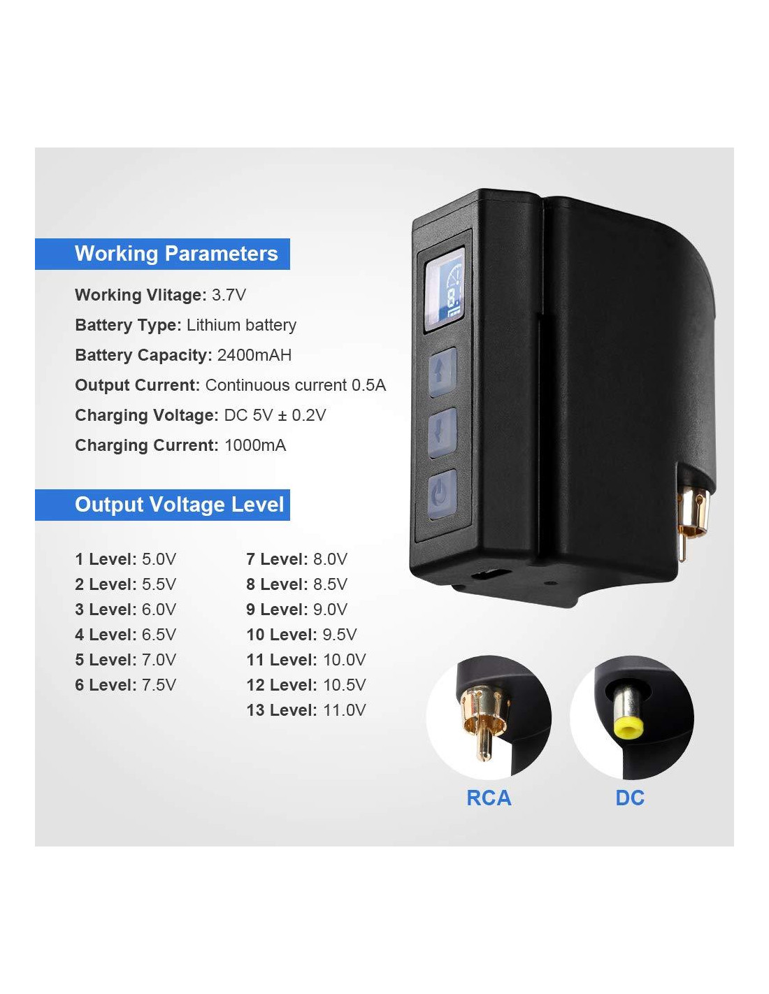 - Tiene una capacidad de 2400mAH, Completamente cargada, Funciona de 4.5 a 11 voltios. La batería de litio dura de 5 a 8 horas dependiendo de tu voltaje y motor. Viene con un control de voltaje de 13 niveles de 5V-11V. Si tienes 2 paquetes de energía, ¡puedes tatuar durante una sesión de todo el día! ¡Carga un paquete de batería mientras tatúas con el otro!